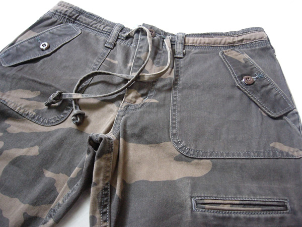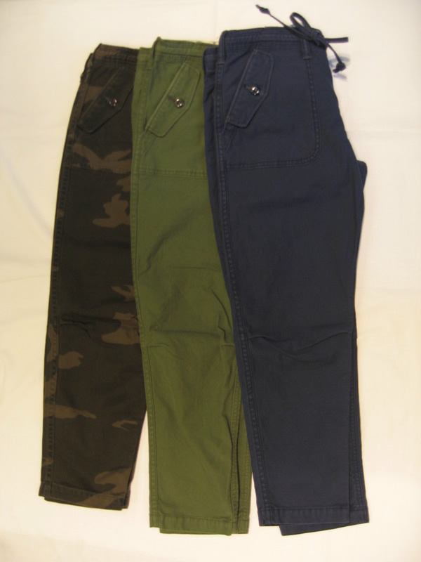 全てデザインは一緒ですが、迷彩柄はコットン100%、無地のカーキ・ネイビーはコットン95%×ポリウレタン5%素材を使用しています。裾が少し細くなっていますので、すっきりとしたデザインなのでゴツさはありません。