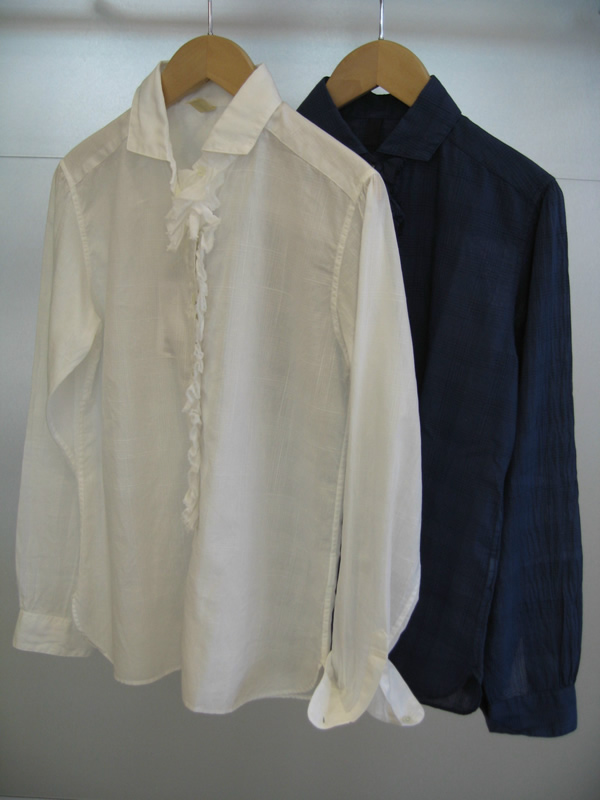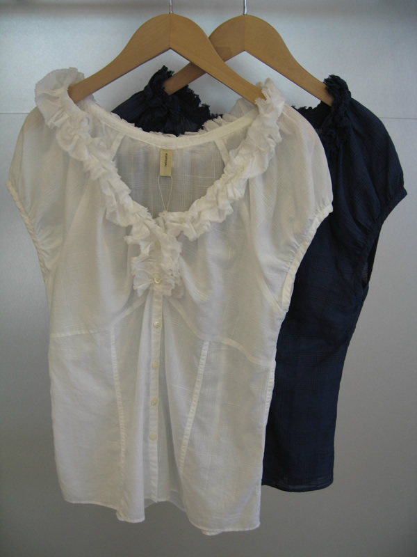 左写真の前開きの長袖のシャツは、アシンメトリーに付いたフリルで少し辛口モードな印象に。わりとゆったりめのシルエットですので、羽織りとして着ても◎。昨日のブログでも羽織ってベルトして着ていますよ。右写真のフレンチスリーブのブラウスは、首元の華やかなフリルがゴージャス感をプラス。また、こちらのタイプはウエストシェイプですっきりとしたシルエットに仕上がっており、女度UP間違いなしです。