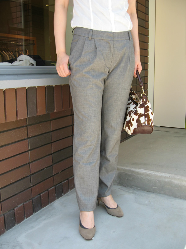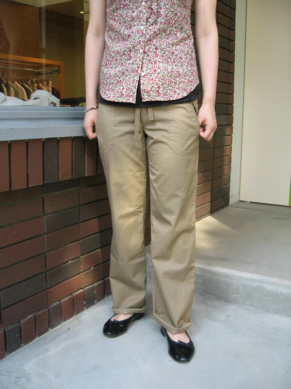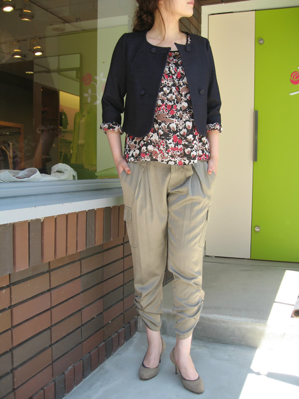 やっぱり今年はカーゴ人気が高いです。でもこのパンツは、タック入り、光沢素材を使用、裾がシャーリングできるなどディテールにこだわっており、ヒールなどでかっこよく着こなすのが◎。