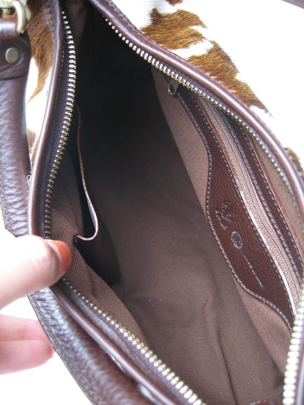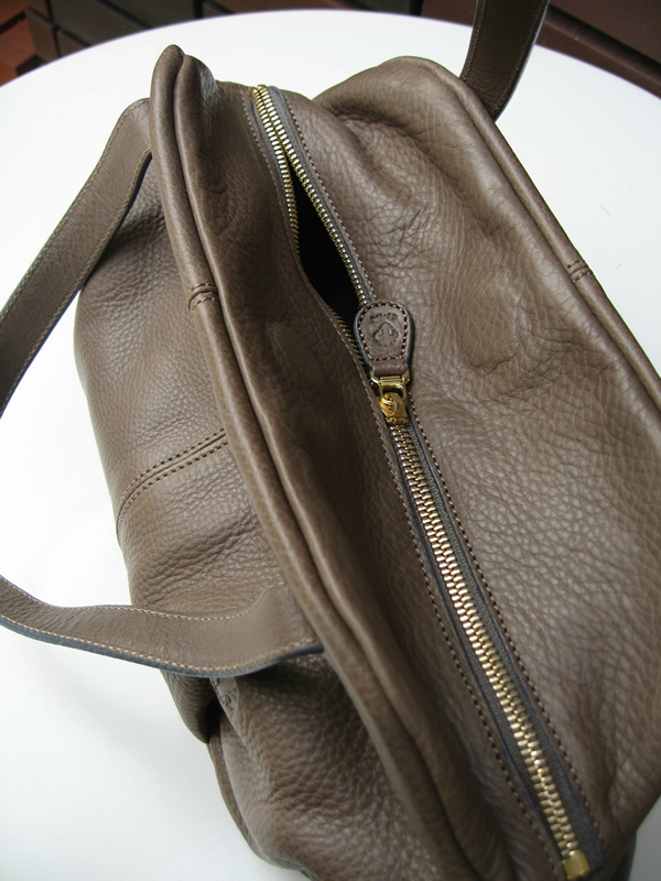 こちらも内側は、サイドにポケットが付いていて、鍵や携帯電話もきちんと収まります。バッグの口は、ファスナーの開閉ですが、左写真でも分かるように谷折りのような感じになっており、ファスナーを閉めた後、さらに磁気(よく見ると丸い磁石が革の内側に取り付けてあるのが分かると思います。)で口を閉じることができます。