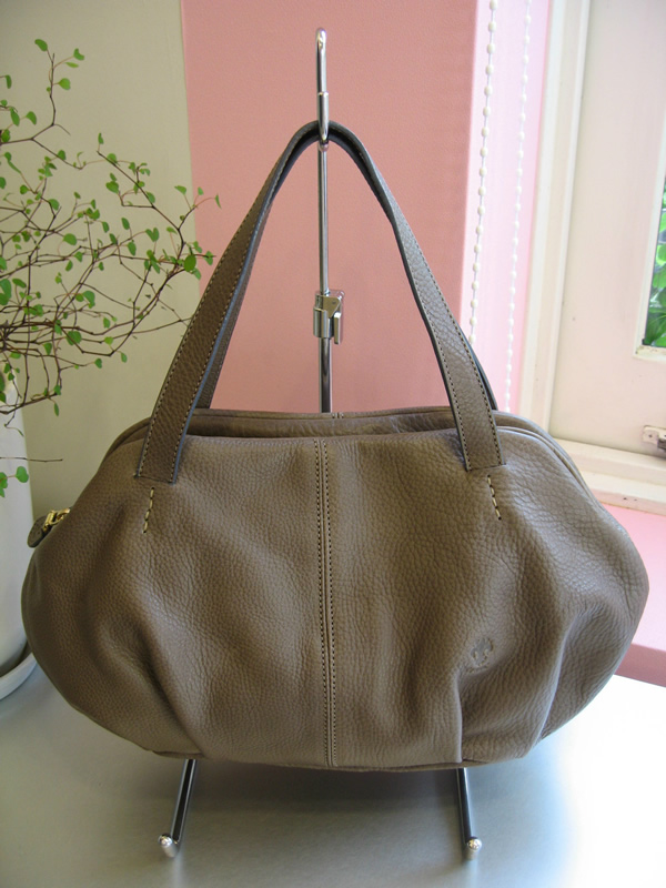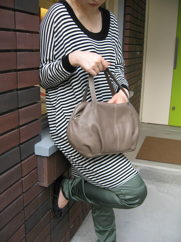 コロンとしたフォルムが可愛らしい新作バッグ。何ともいえないマットなグレーがとてもシックですね。以前、違うモデルでこのグレーの色合いがたいへん好評でしたので、今回も反響がありそうです。こちらもタウンユースには使いやすいサイズ感。物をたくさん入れても、ギャザーが入っているので安心、もっと丸みが出ていいかもしれません。