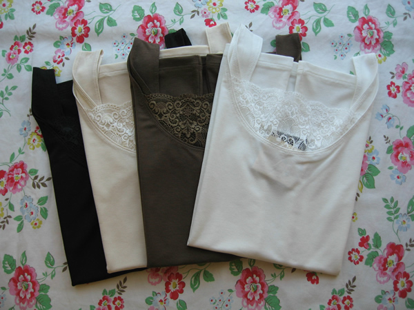 このレースキャミは、Cachetteでも展開していて、とても好評だったシリーズです。レース部分がわりと上の方にくるので重ねてもレースがちゃんと見えます。