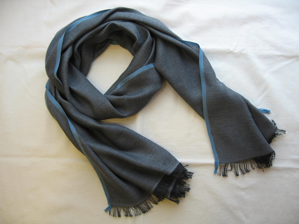 シルクとカシミヤをブレンドした糸と、リネンを交織したストール。ベースカラーはシックな色合いにし、ストールのエッジにシルク糸で軽やかな差し色を入れています。ストールを巻いた時にエッジのカラーがのぞくデザイン。シンプルな中の小さなアクセントが、コーディネートに品のあるスパイスを加えてくれそうです。カシミヤ混ですが、暑苦しい感じはなく、この時期からも気持ちよく巻いていただけます。日焼け防止も兼ねて、持ってて間違いのないストールです。