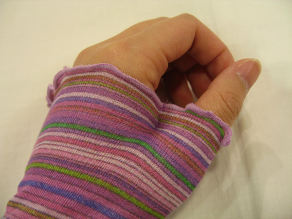 手を通してみると、柔らかな素材で付け心地は抜群。程よくフィットし、圧迫感もありません。指の部分は親指の部分だけが分かれているデザイン。上の写真でも分かるように、二の腕の真ん中位までの長さがあります。