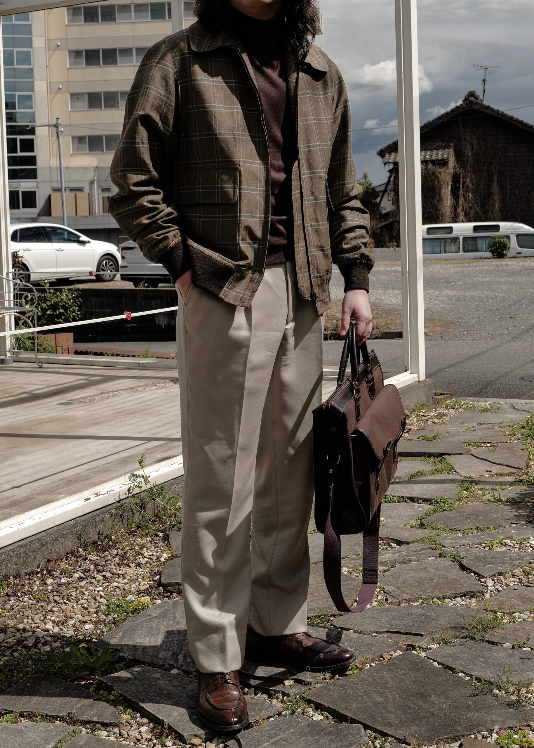 主張が控えめな色合いと英国生地らしいハリのある質感。渋みあるウインドウペン柄なので、着こなしの組み合わせも自由自在ではないでしょうか。