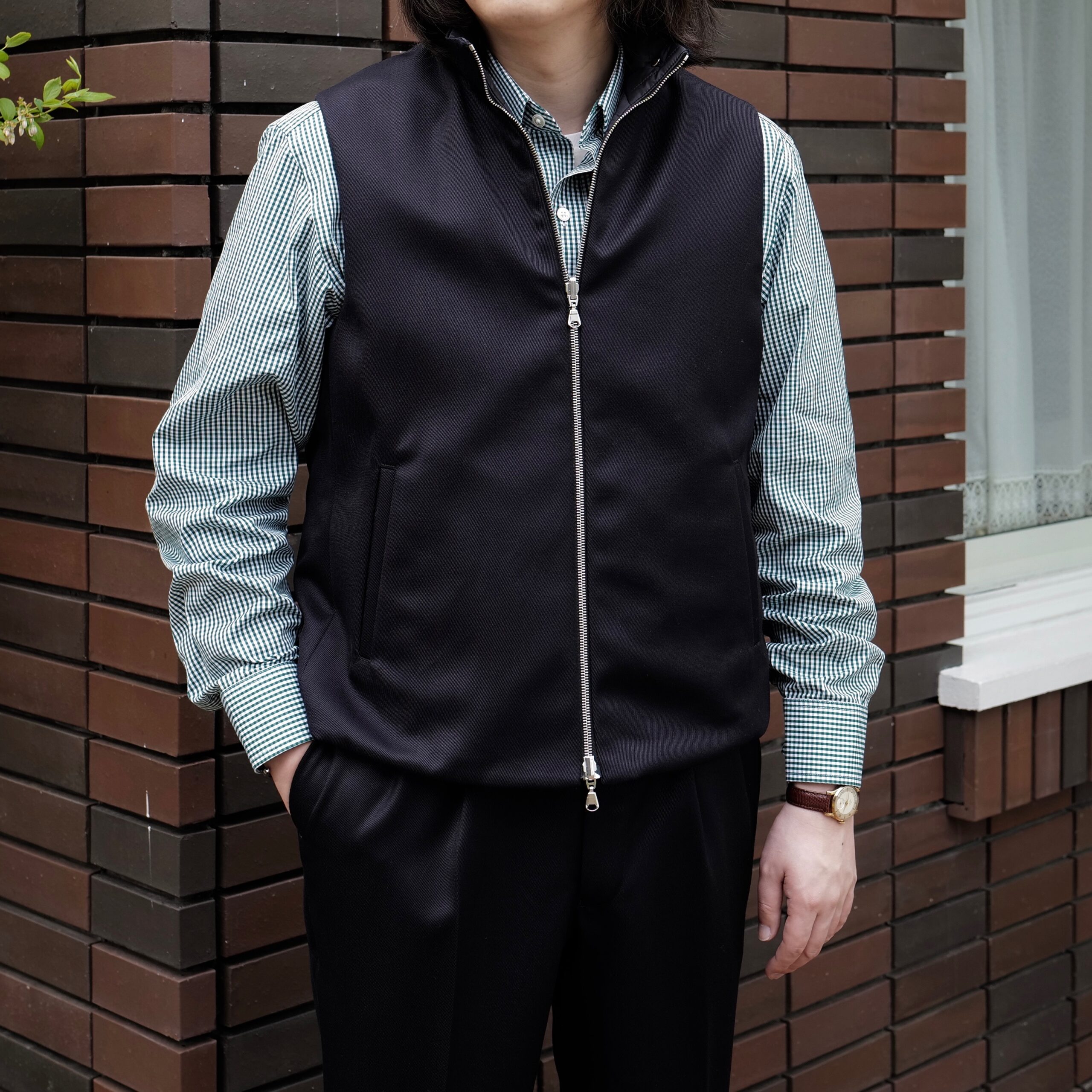 ブリティッシュスタイルに欠かせない立ち襟の乗馬ベストをベースにした仕上がりで、佇まいはシンプルながらも身に纏ってみるとエレガントな装いになってしまうのはWhiteley&Greenが誇るキャバリーツイルクロスの素晴らしさ。