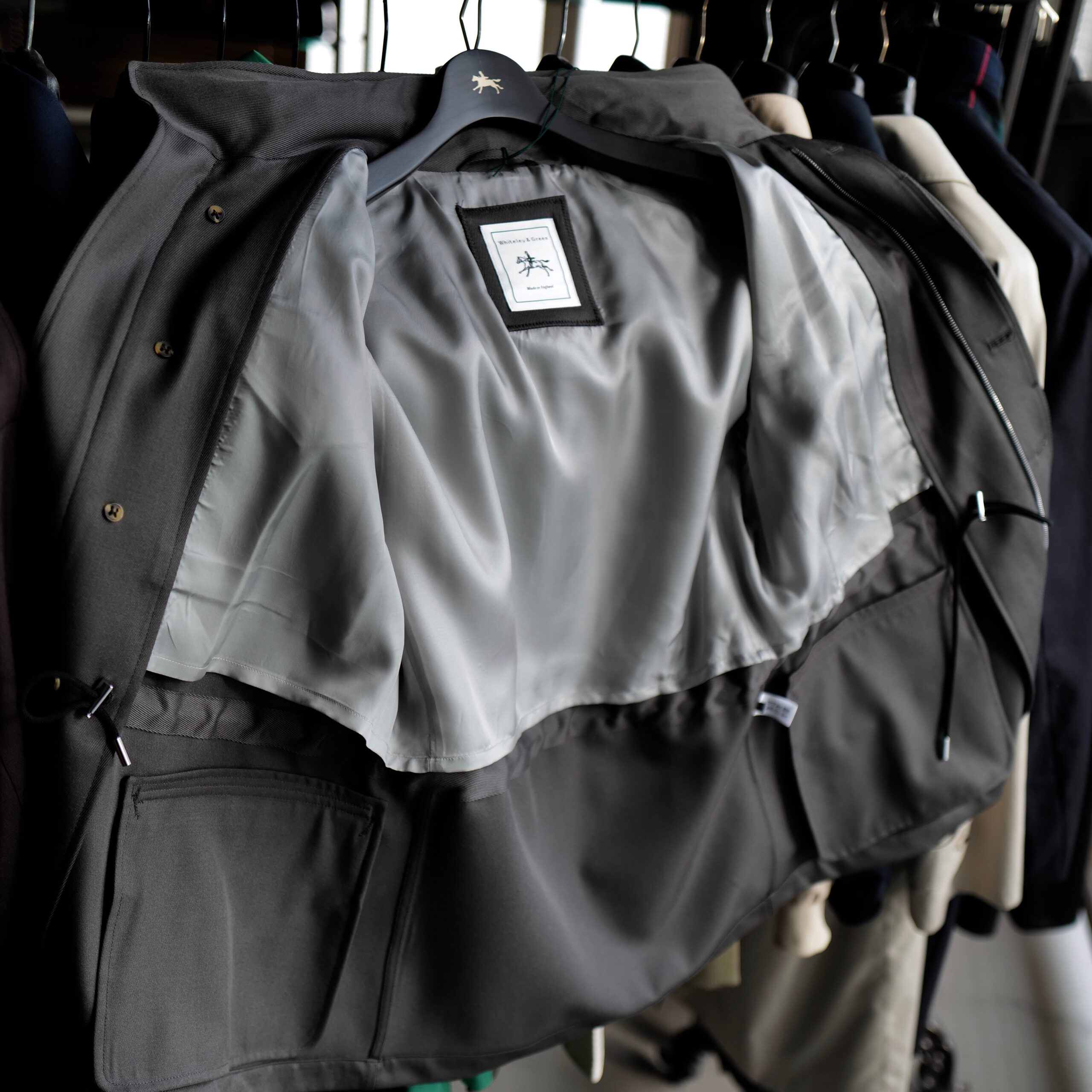 一般的なキャバリーツイルは生地に重みがあるため秋冬がメインとなりますが、【Whiteley&Green/ホワイトリーアンドグリーン】は滑らかな風合いと軽い着心地を叶えてくれる唯一無二な生地です。目はしっかり詰まっているので、耐久性もしっかり確保しながら雨や風も防いでくれる機能性の高さもです。