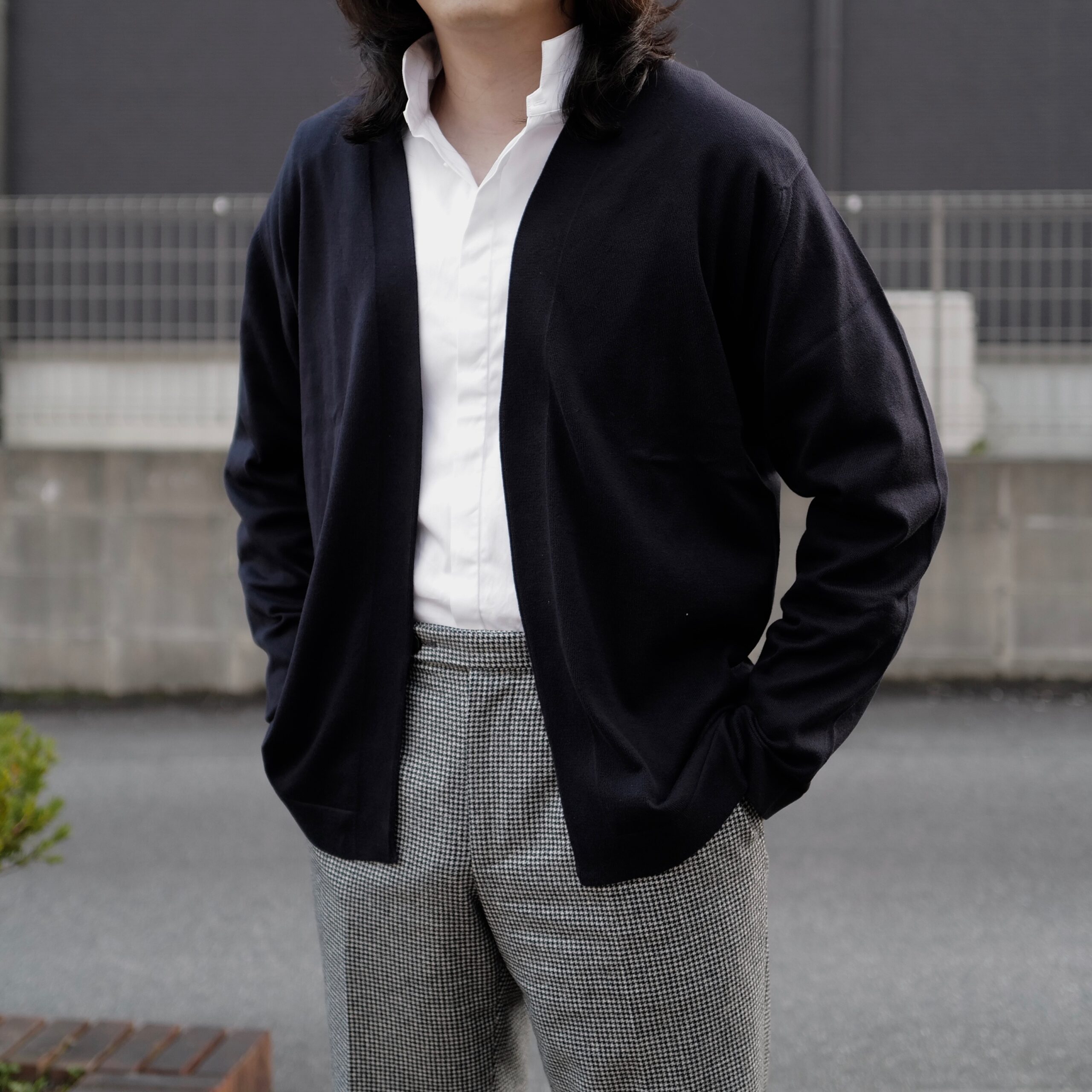 薄手のニットやシャツの上から、もしくはカットソーでも良いですが、羽織っておくと格好良さはもちろんですが、昼と夜の気温差に柔軟に対応してくれるので私自身も出番が多いです。今日はシャツの上から羽織っているだけですが、丁度良い季節感の塩梅で気分も上がります。