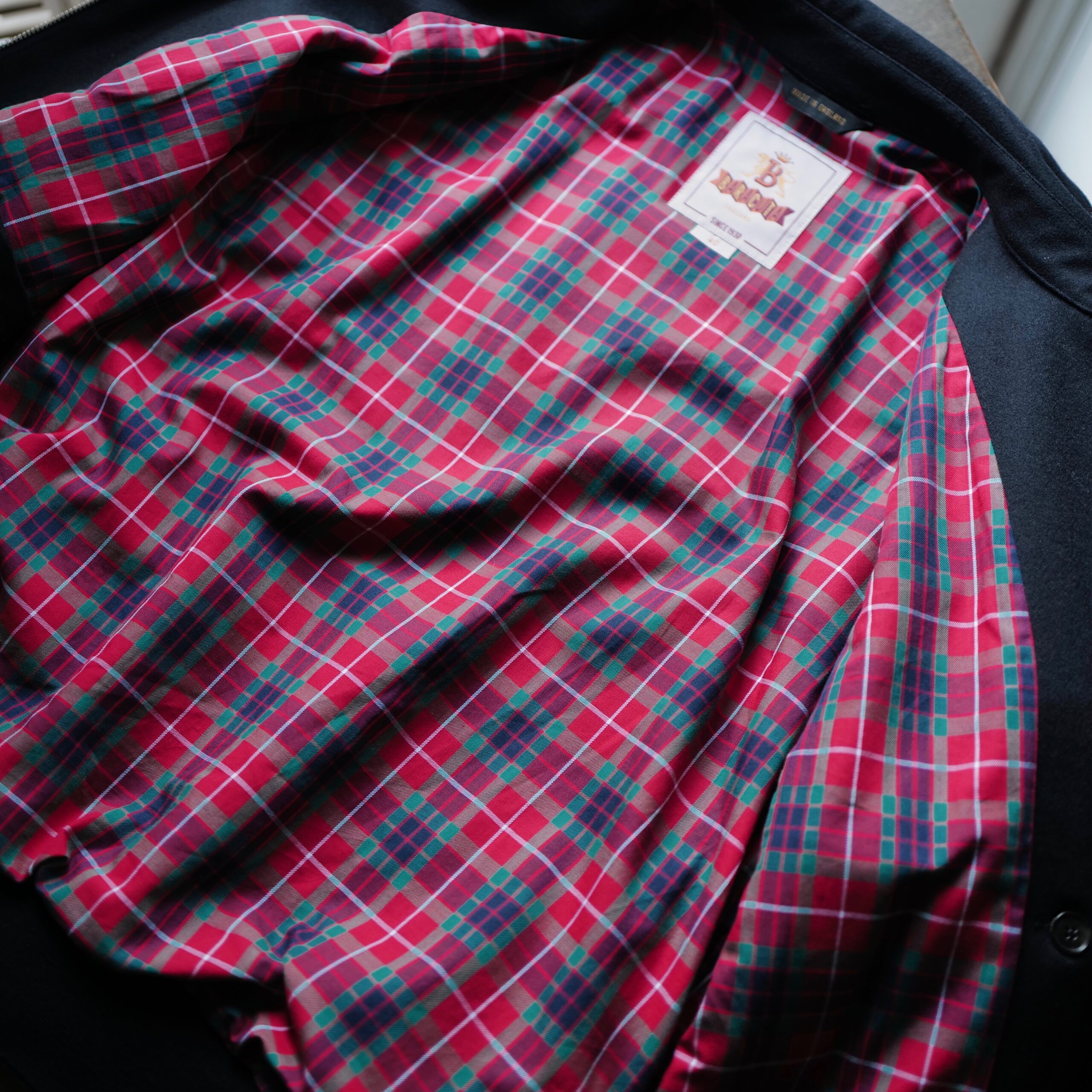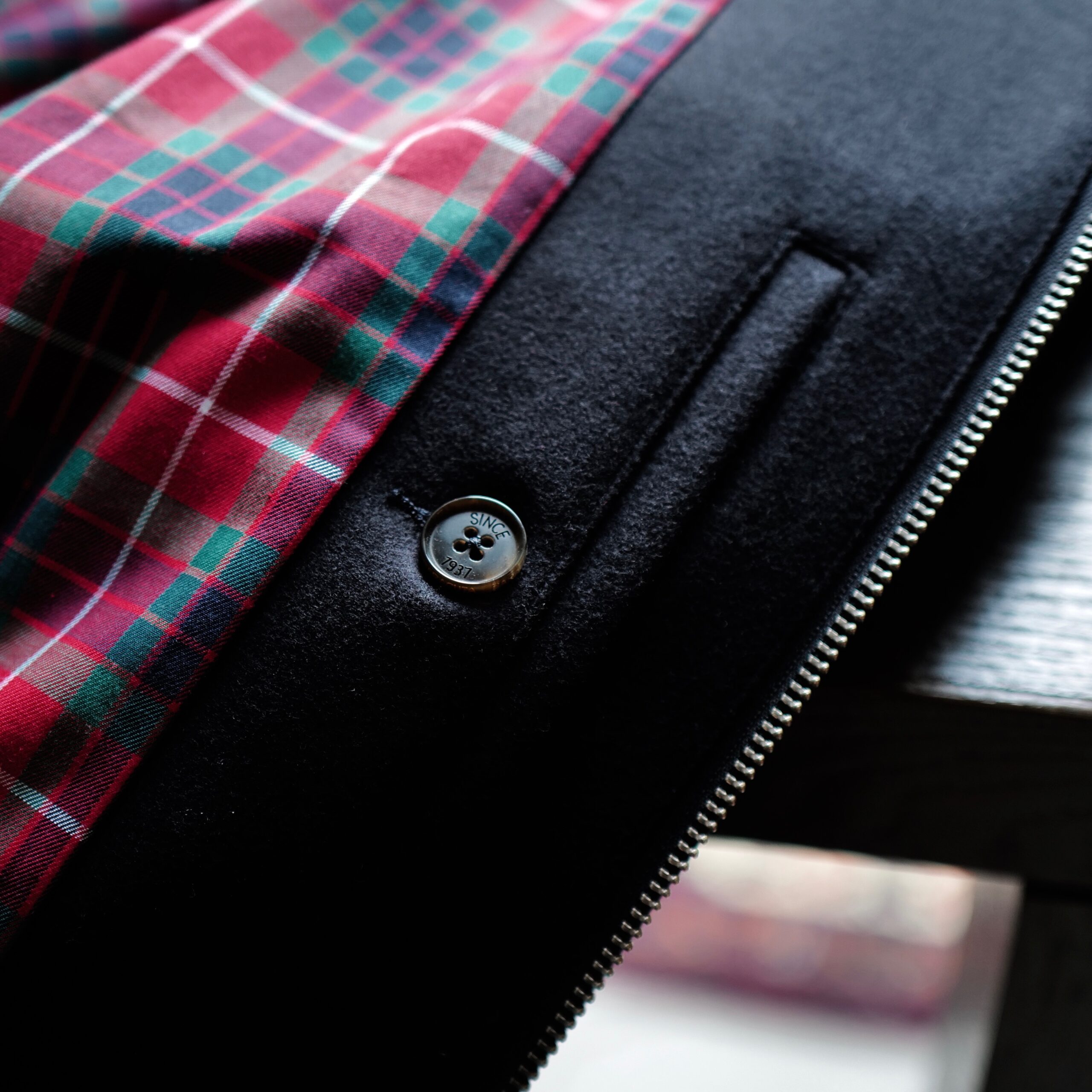 裏地はアイコニックなフレイザータータンチェックになっていますが、着用した際には「G9」とは違い、チェックが表からは見えないようにフロントジップの裏部分を無地にした控えめに仕上げていました。