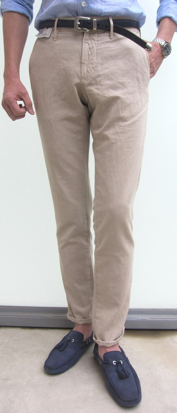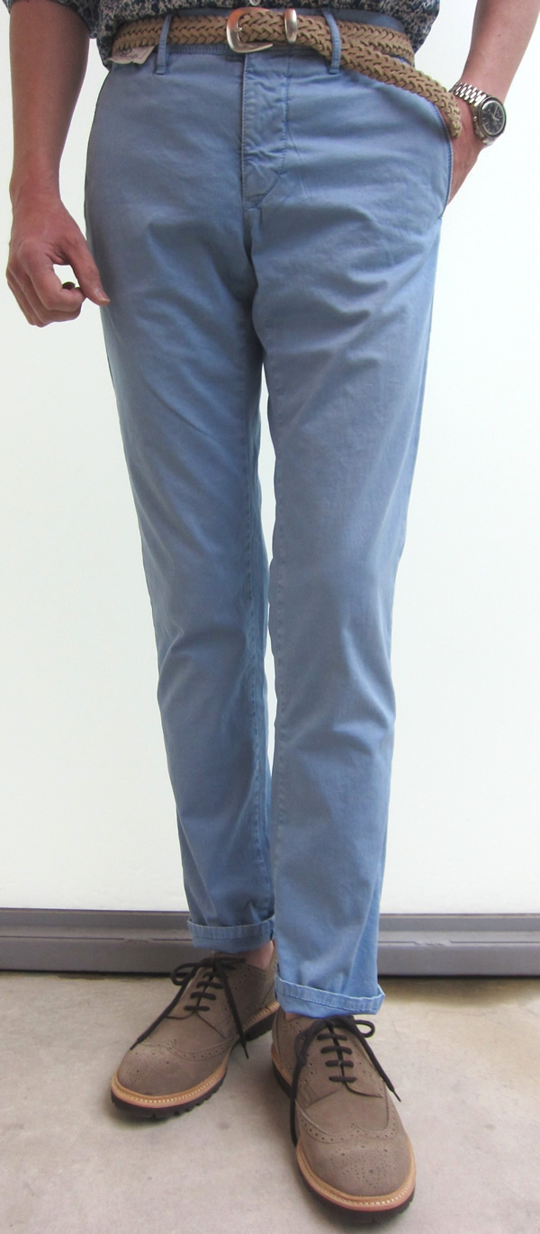 モデルは身長175㎝、体重63㎏、胸囲91㎝でサイズ30を穿いております。上のコーディネートで合わせたシャツはGlanshirt(未公開)、ベルトはFAUSTO COLATTO、靴はDOUCAL'Sです。