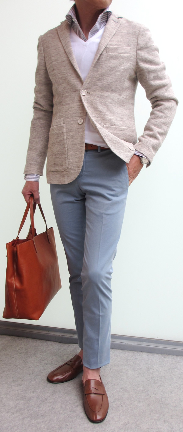 モデルは身長175cm、体重63K、胸囲91㎝でサイズSを着ております。ベージュで合わせたシャツはGlanshirt、パンツはJ.W.BRINE。ネイビーで合わせたカット&ソーはthree dots(私物)、パンツはJACOB COHENです。