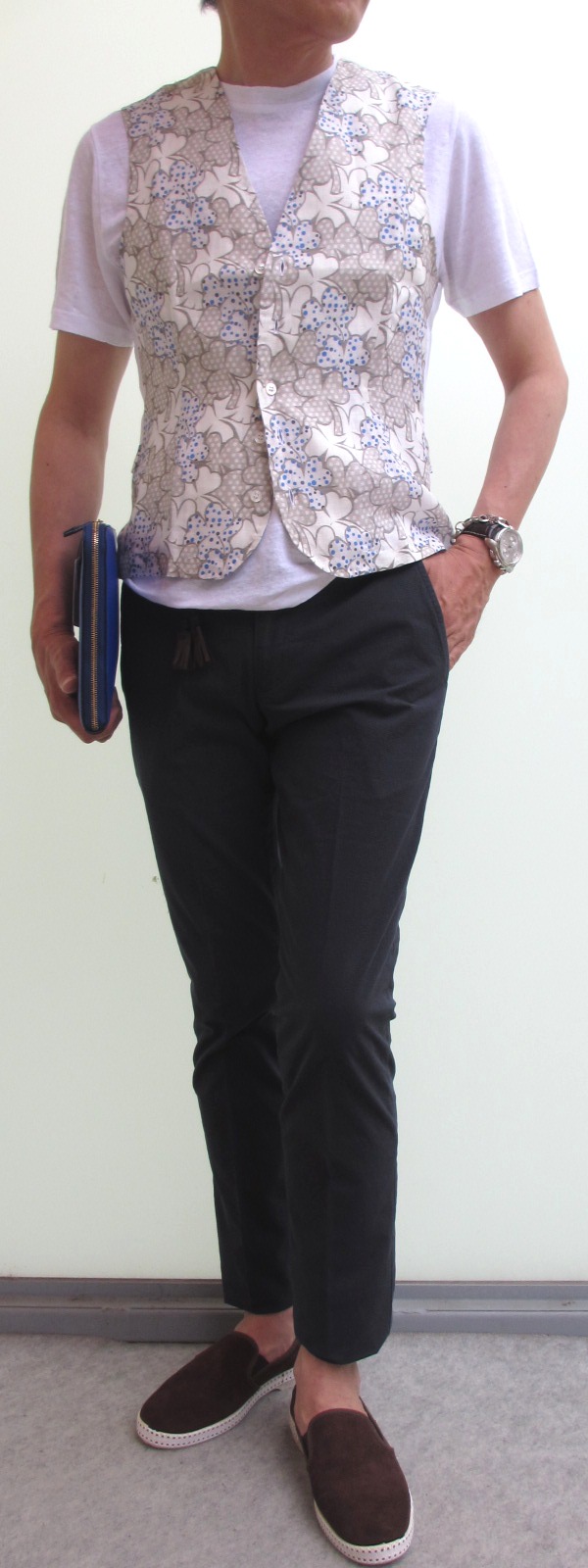 モデルは身長175cm、体重63㎏、胸囲91㎝でサイズ46を着用しております。ブルー×ベージュで合わせたシャツはBagutta、ショーツはSIVIGLIA、ベルトはAnderson's、靴はDOUCAL'S。ホワイト×グレージュで合わせたTシャツはSCAGLIONE、パンツはSIVIGLIA、ベルトはD'AMICO、靴はRivieras、手に持ったバッグはCISEIです。