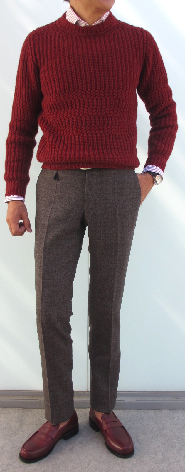 コーディネートで合わせたシャツはBARBAのDANDYLIFE、ベルトはWilliam、パンツはINCOTEX(未公開)。靴はボルドーがParaboot、チャコールグレイがCROKETT&JONESです。