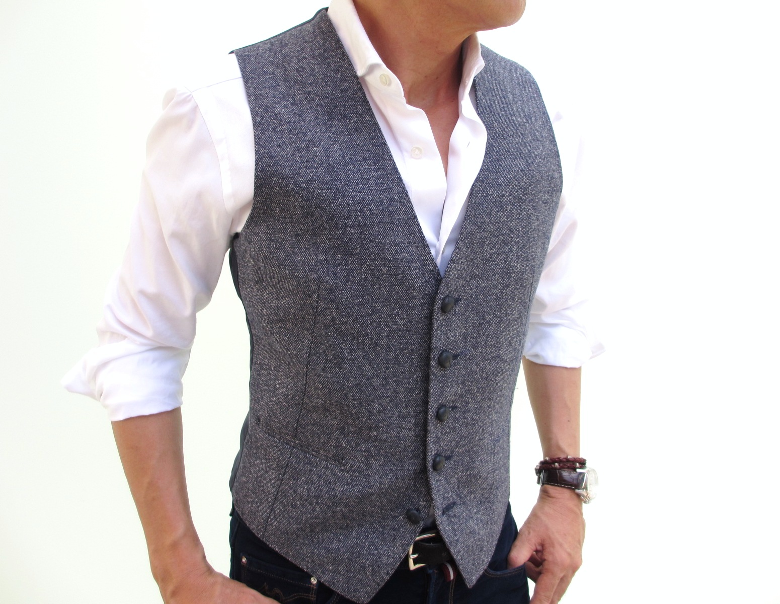 共地のジレもご用意しました。ラフなジャケットスタイルをエレガントに見せてくれるジレ。ジャケットと合わせて持っていると、いざと言う時に便利です。