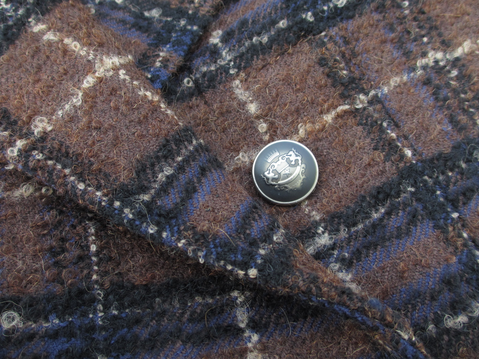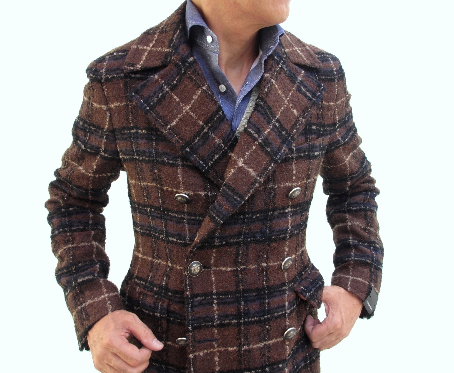 紡毛素材を用いた大柄タータンチェックは存在感あり。温かみのある素材に、敢えてクールなメタル釦が効果的です。