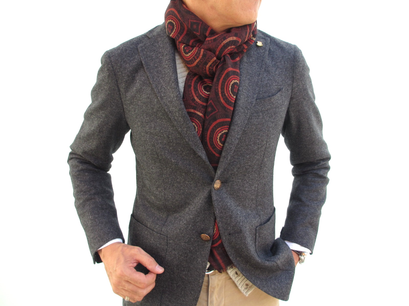 モデルは身長175㎝、体重63㎏、胸囲91㎝でサイズ44をややタイトに着ております。合わせたシャツはBARBAの「CULTO」、ジレはTAGLIATORE(未公開)パンツはPT01の「TORINO」、ベルトはWILLIAM、靴はParabootです。