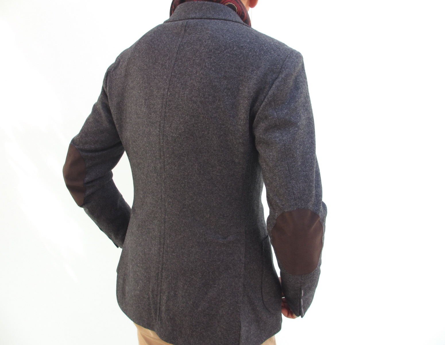 チャコールのウールジャージにダークブラウンのエルボーパッチ。パッチ素材はアルカンターラです。