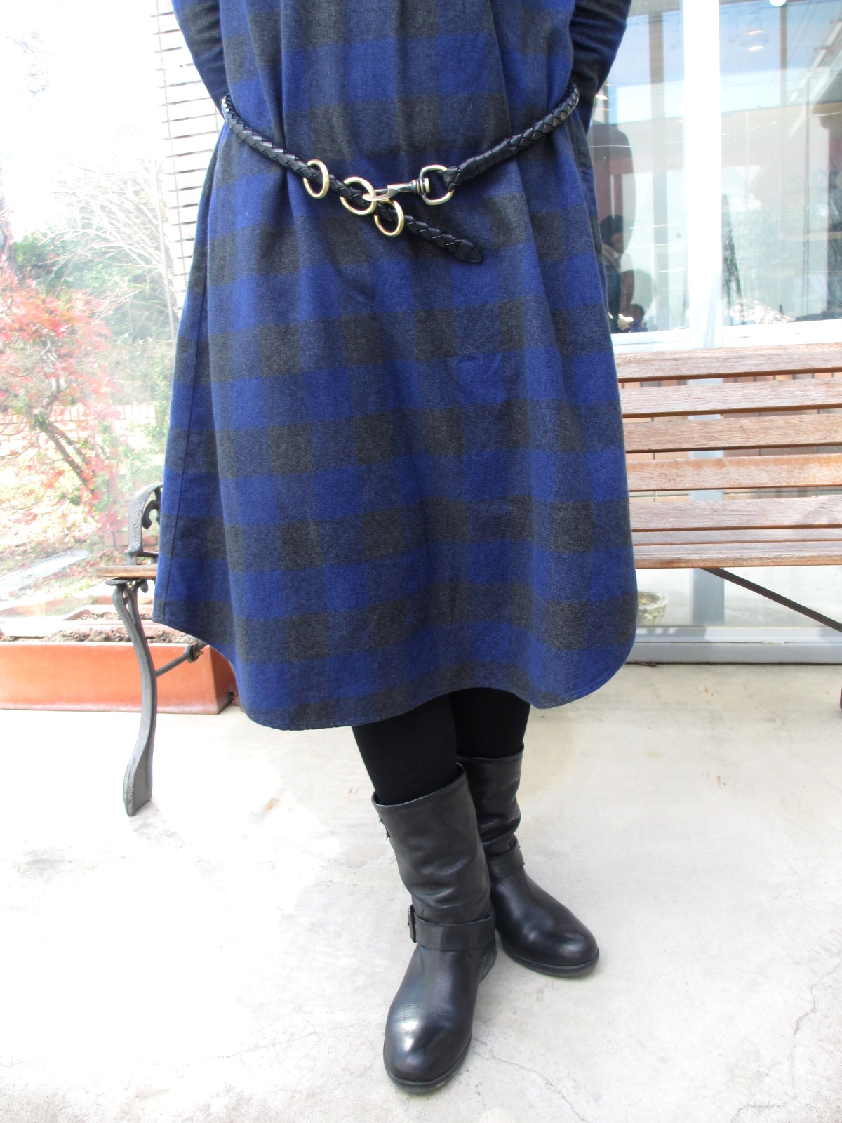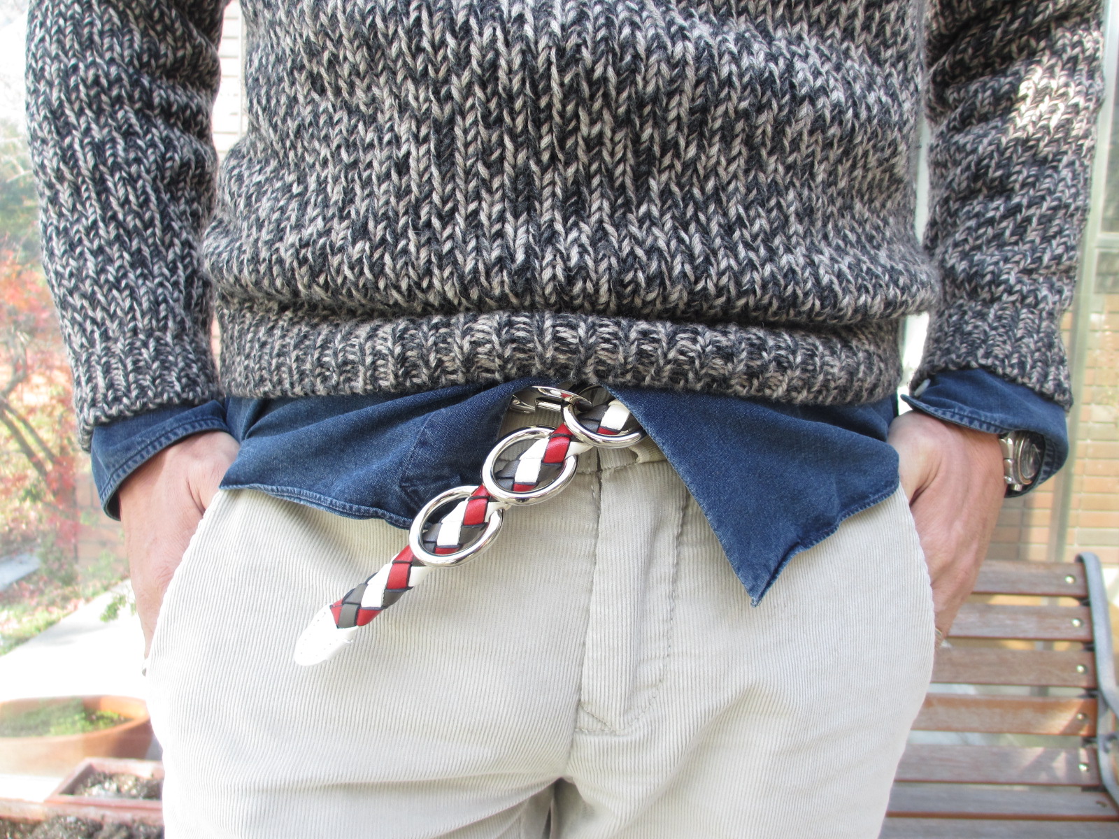 ちょっと無理やりな気がしないでもないのですが、本日の私の出で立ちに付けてみました。もう少し軽やかな服装のほうが合いそうです。イメージだけ摑んでください。サイズは90を、真ん中のリングに入れるのでしたら、85が良さそうです。
