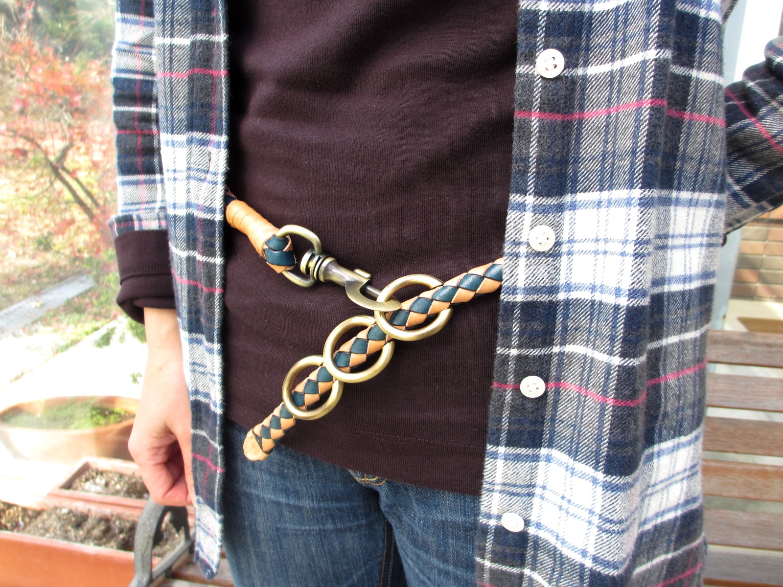 良質のカーフを使用した袋式イントレチャート。3つの調整リングとフック式の留め具。なんともユニークなデザインのベルトです。レディースにと思いましたが、はめてみるとメンズでもいい感じです。
