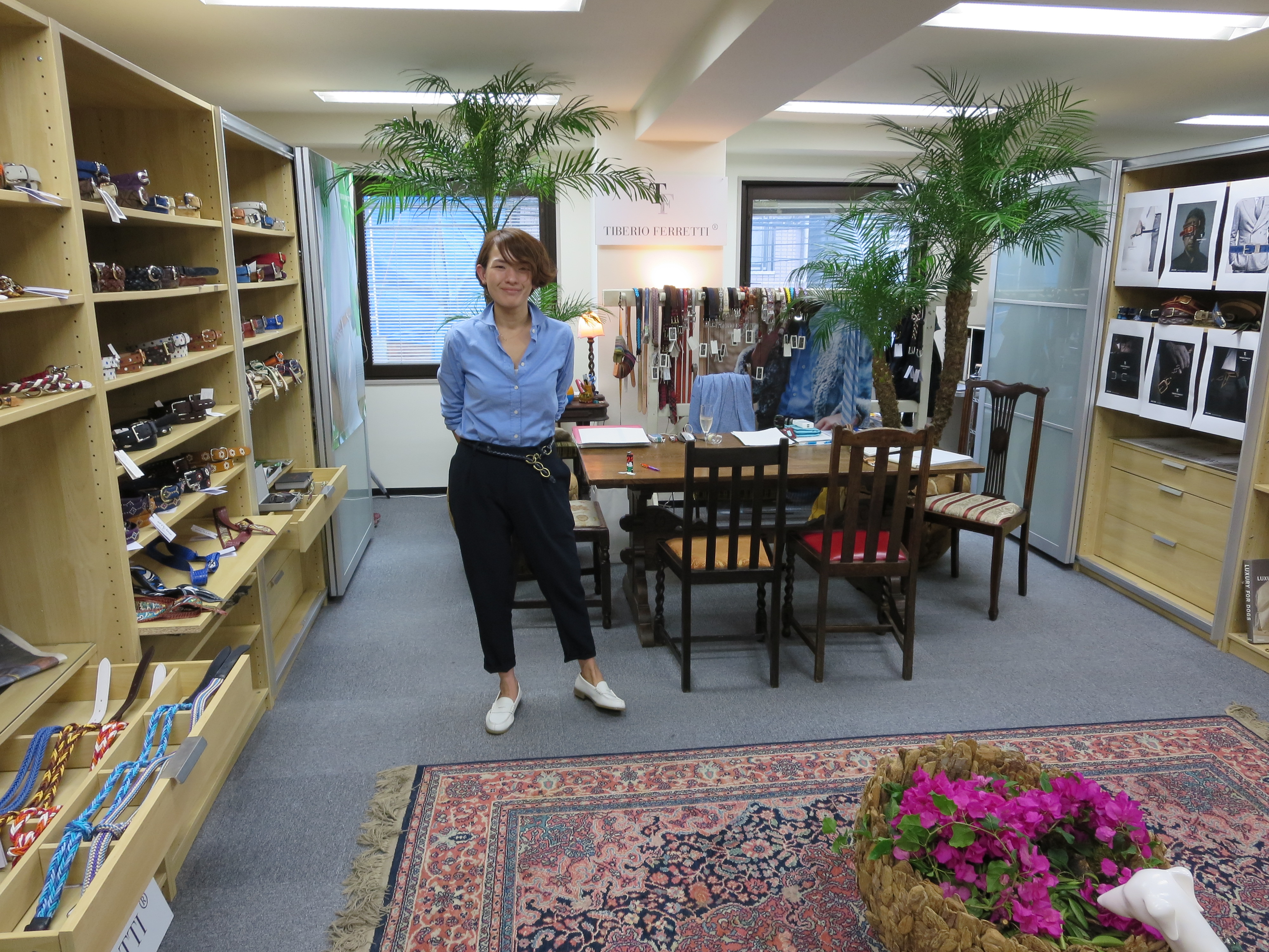 コレクションを見るだけのつもりで訪れたショールームですが、彼女が身につけているベルトに思わず目が。ブルーのシャツにブラックのパンツ。足元は白のスリッポンとシンプルなコーディネートながら、どこか輝いて見えるのは、このベルト。そう、これが【TIBERIO FERRETTI/ティベリオ フェレッティ】の凄さなんです。素材の良さと手作りの温かみ。そしてデザインのユニークさが魅力。また私たちの品揃えに輝きのあるブランドが仲間入りです。2015年春夏第一弾は、新登場の【TIBERIO FERRETTI/ティベリオ フェレッティ】からです。