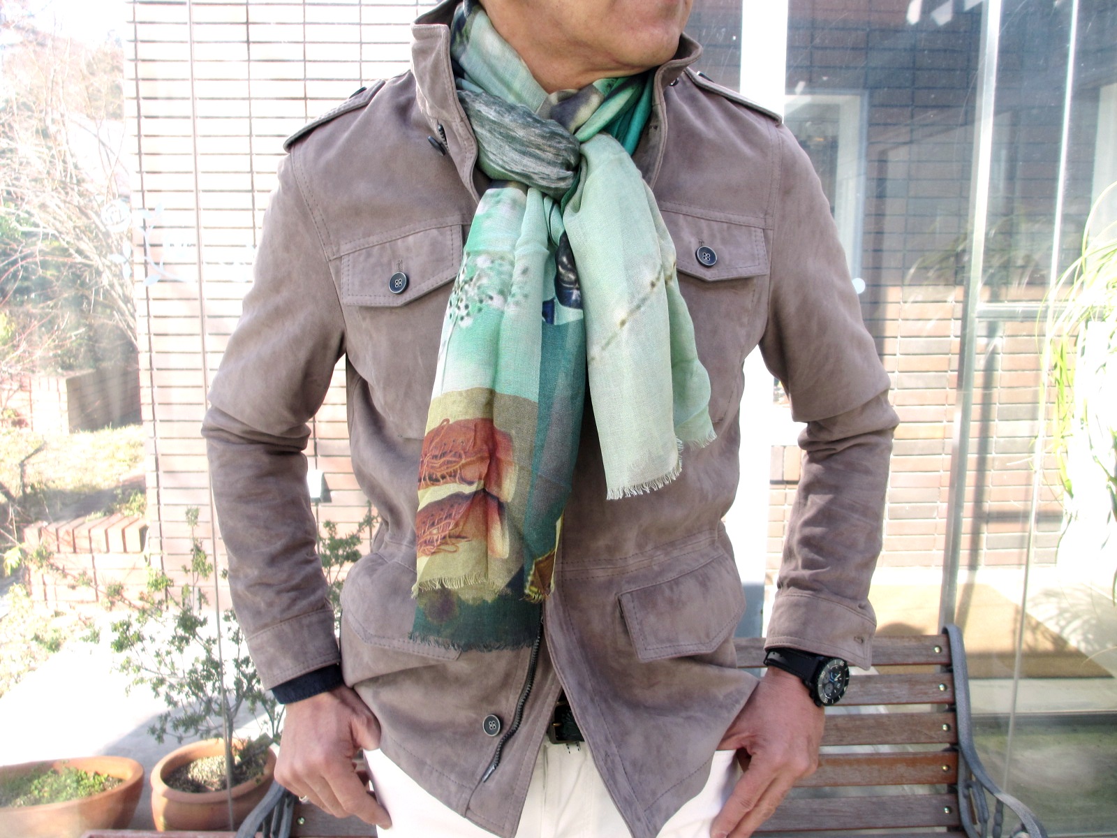 そして、着替える前の助走として、本日の出で立ちに羽織ってみたら、「案外、いけるじゃん!」とその気になってしまい、撮った写真がこちらです。