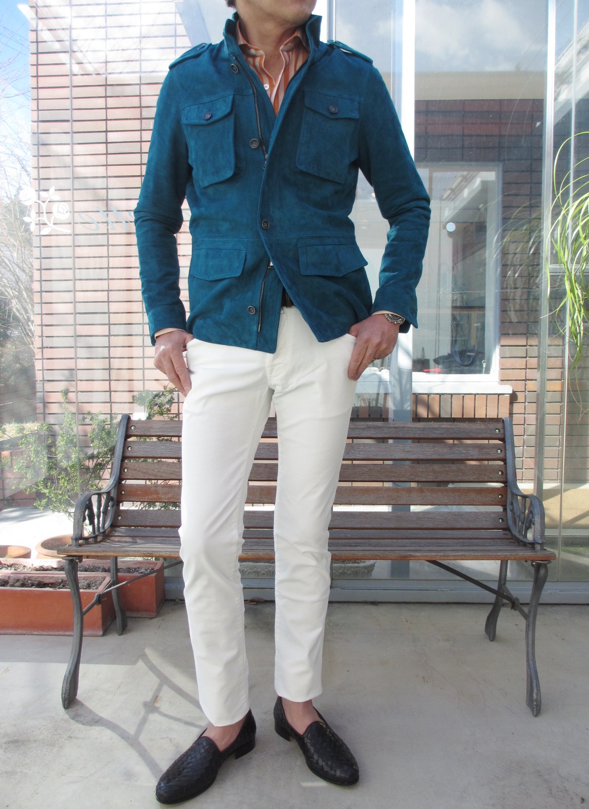 足元を更に明るくすれば、初夏の装いとしても活躍します。レザーの面白さは、流行とは別のところにあるもの。好きな方にとっては、堪らない一着になりそうです。なんとなく、立ちポーズに違和感が。そうです。寒いんですよ...