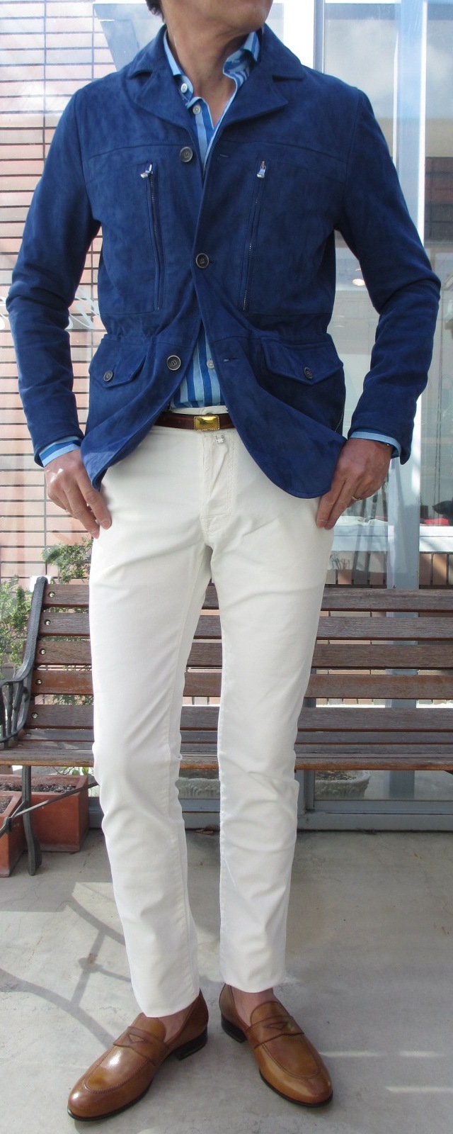 モデルは身長175㎝、体重63㎏、胸囲91㎝で、サイズ46を着用しております。オーカーブラウンで合わせたシャツは Bagguta、パンツはJACOB COHEN、ベルトはFAUSTO COLATO、靴はFERRANTE、メタルブルーで合わせたシャツはFinamore(私物)、パンツはJACOB COHEN(私物)、ベルトはFAUSTO COLATO(私物)、靴はParaboot(私物)です。