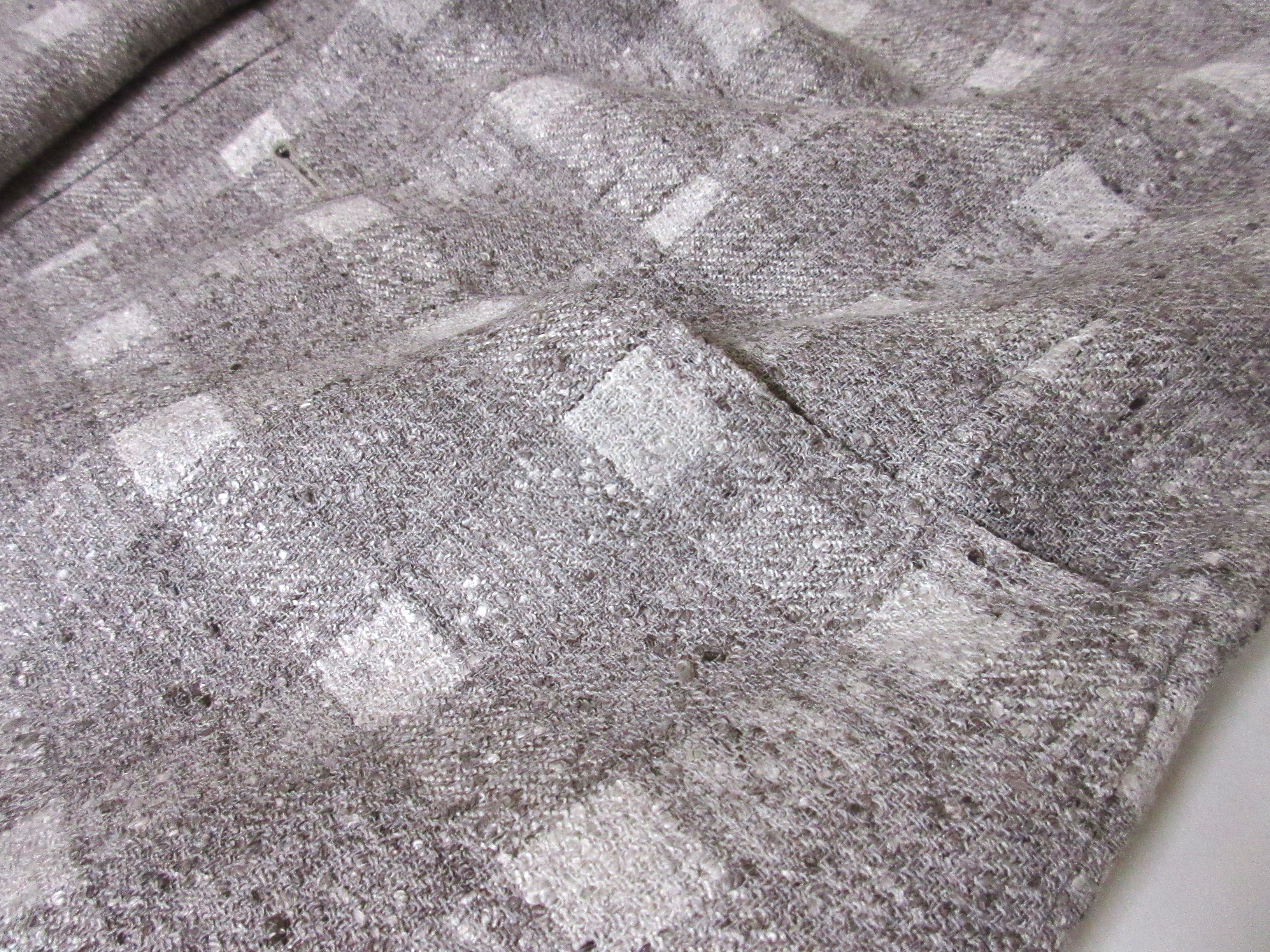 前出のグレンチェックジャケットは、ウールの混紡率が高く、キメ細かでツヤのある滑らかな肌触りでしたが、こちらのジャケットは、リネンやコットンのハリコシやシャリ感が強く、表面にはネップの凹凸があります。