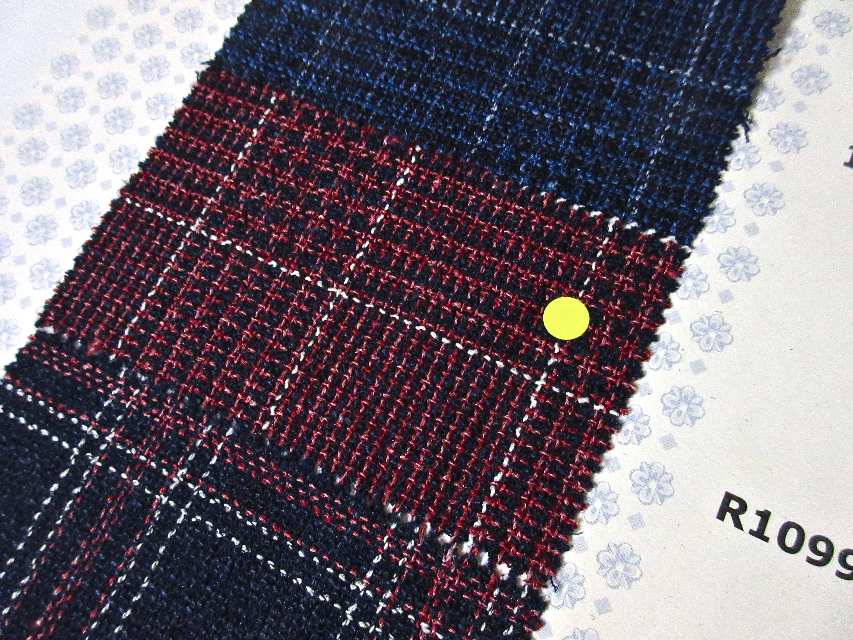 レッドを基調として、ネイビーを掛け合わせたグレンチェック柄。レッドとネイビーが陰影を付けた関係になって、表情に深みを与えてくれます。小さな生地では解りませんが、一本先で走ったホワイトのラインは、ジャケット全体で見ると、しっかりとしたアクセントになってきます。