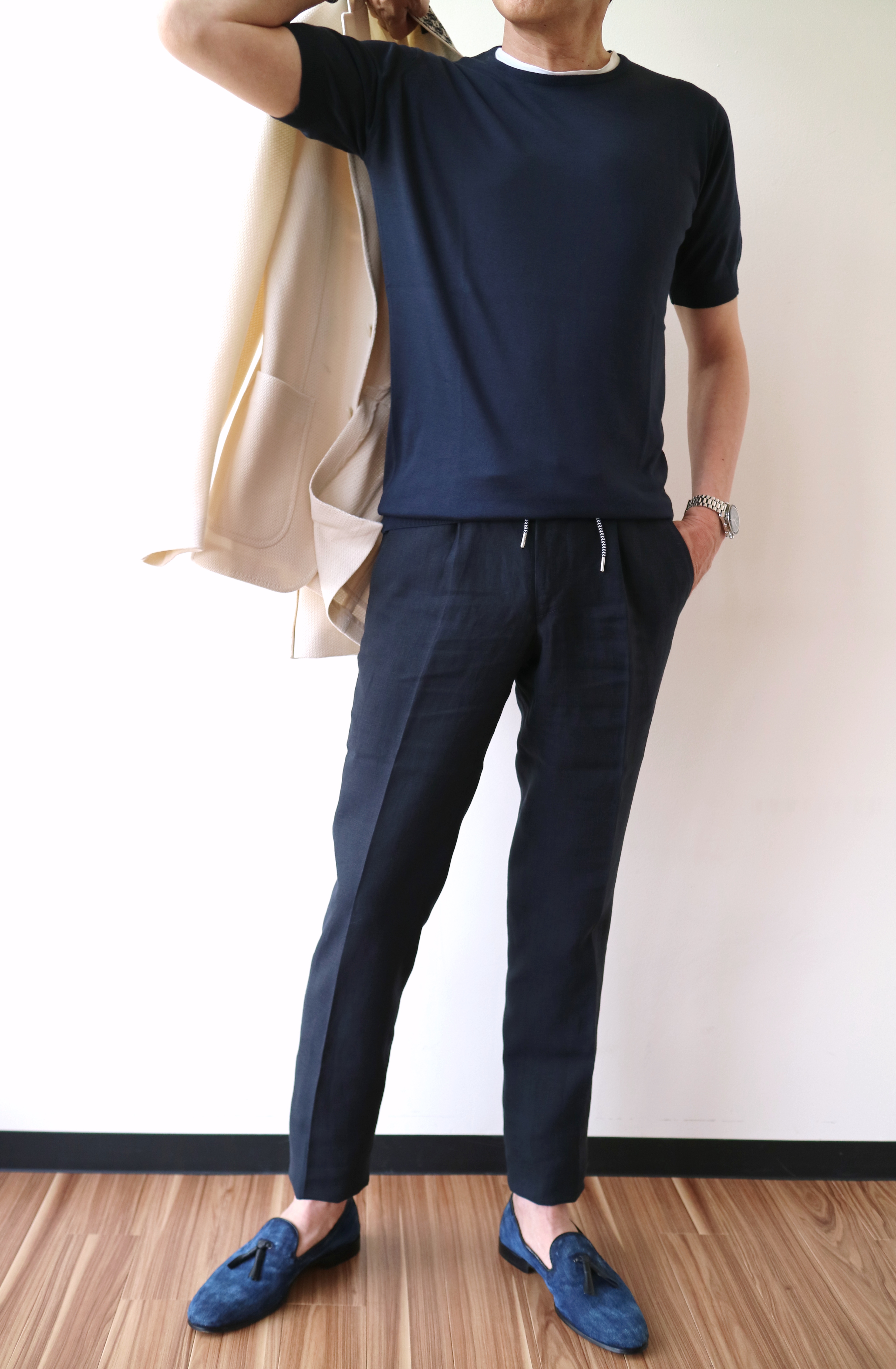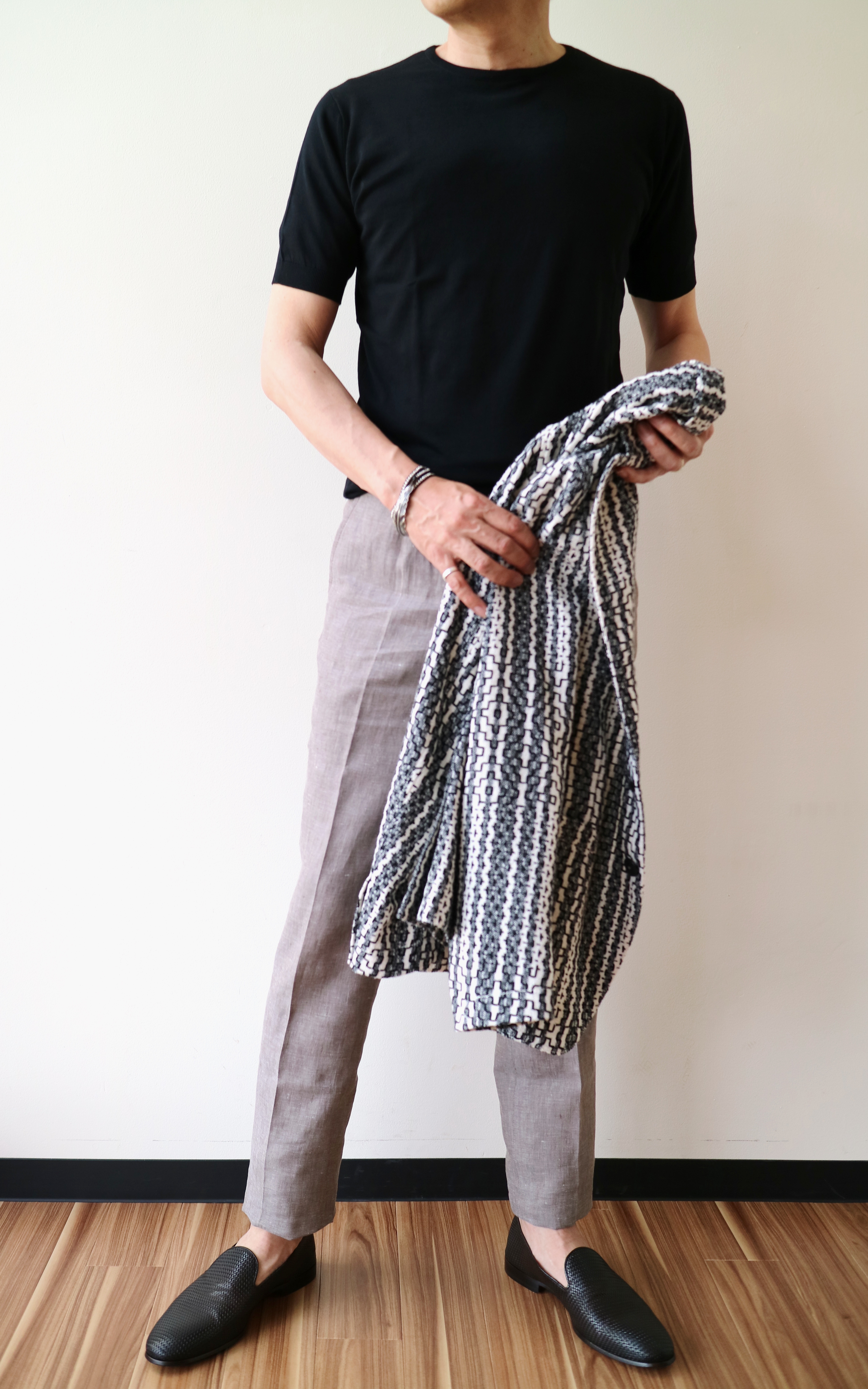 手に持ったジャケットはTHE GIGI、パンツは明日公開予定のVIGANO、靴はDOUCAL'Sです。ジャケットを持つことで、全体のコーディネートが安定します。やはり、オトコの色気とはバランスが重要です。