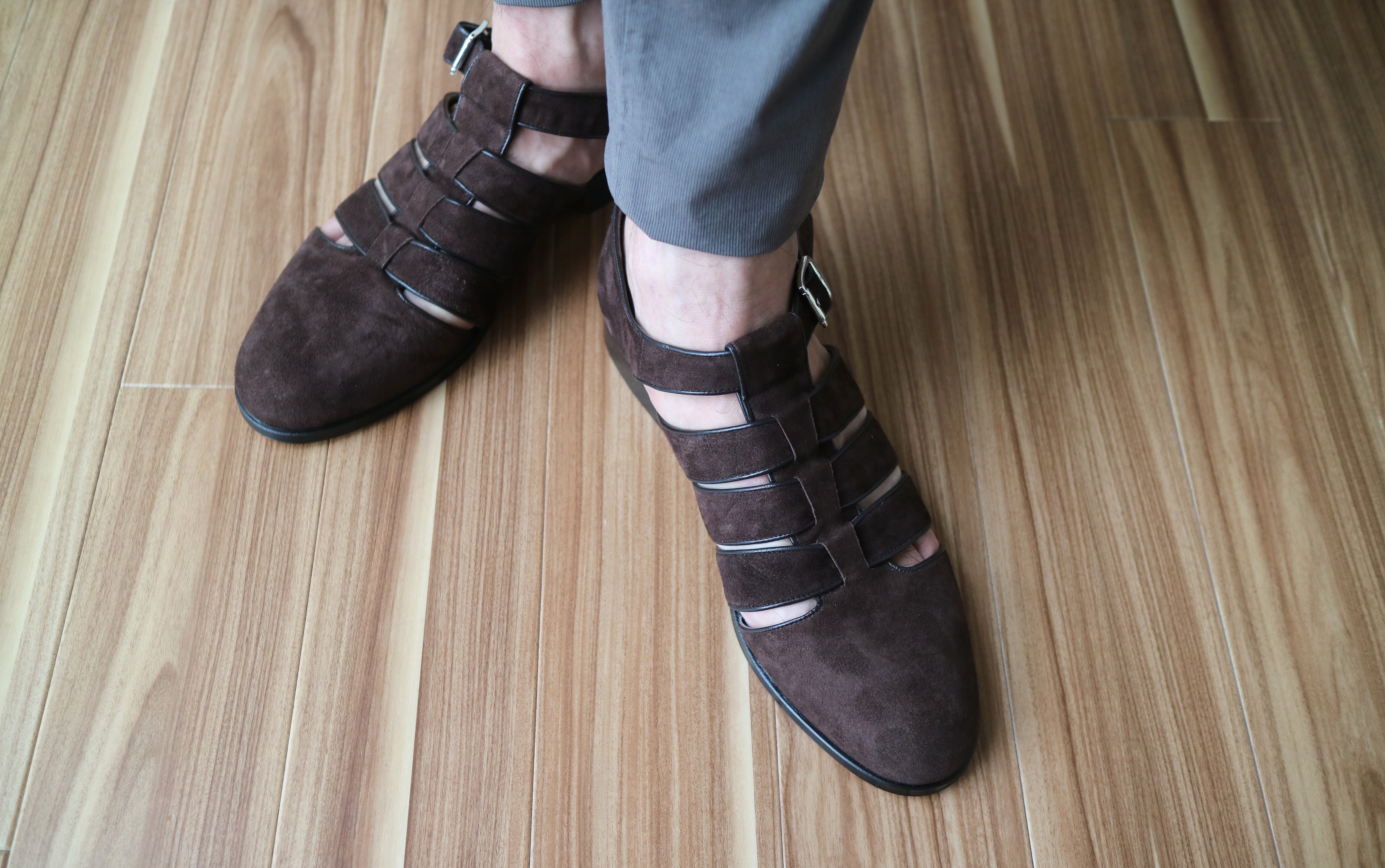 足元は、やはりPMA(ピーマ)のグルカサンダル。リラックス感がありながら、きちんと感ある、場所を選ばない靴です。参考までに手に持ったバッグはCISEI(シセイ)。憧れの逸品です。