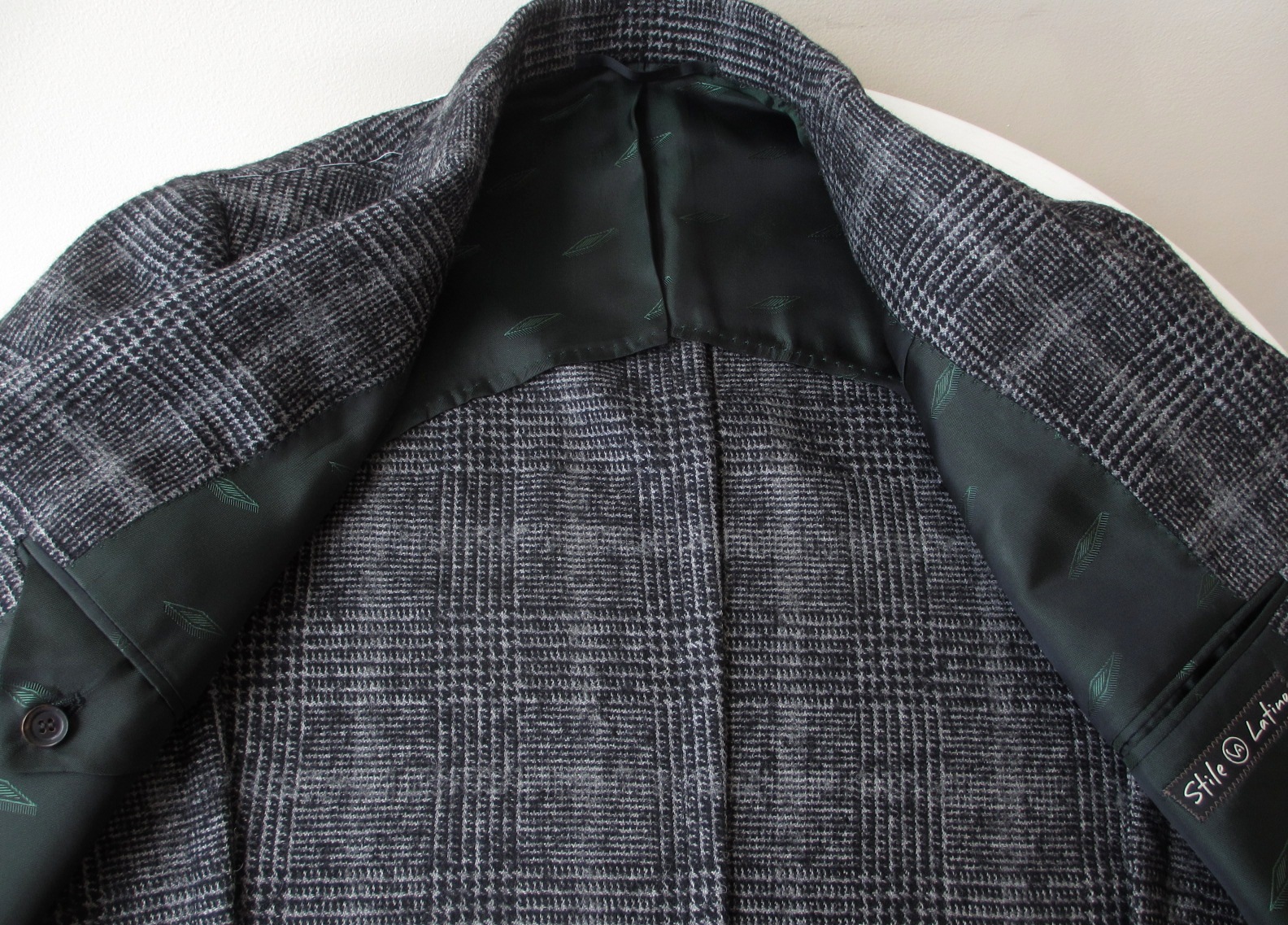 さらに生地グレードが上がります。ベビーアルパカとウールにシルクをブレンドしたグレンチェック柄のジャケット。総裏にすれば、多少のコストダウンになるのですが、やはり背抜きでセレクトです。