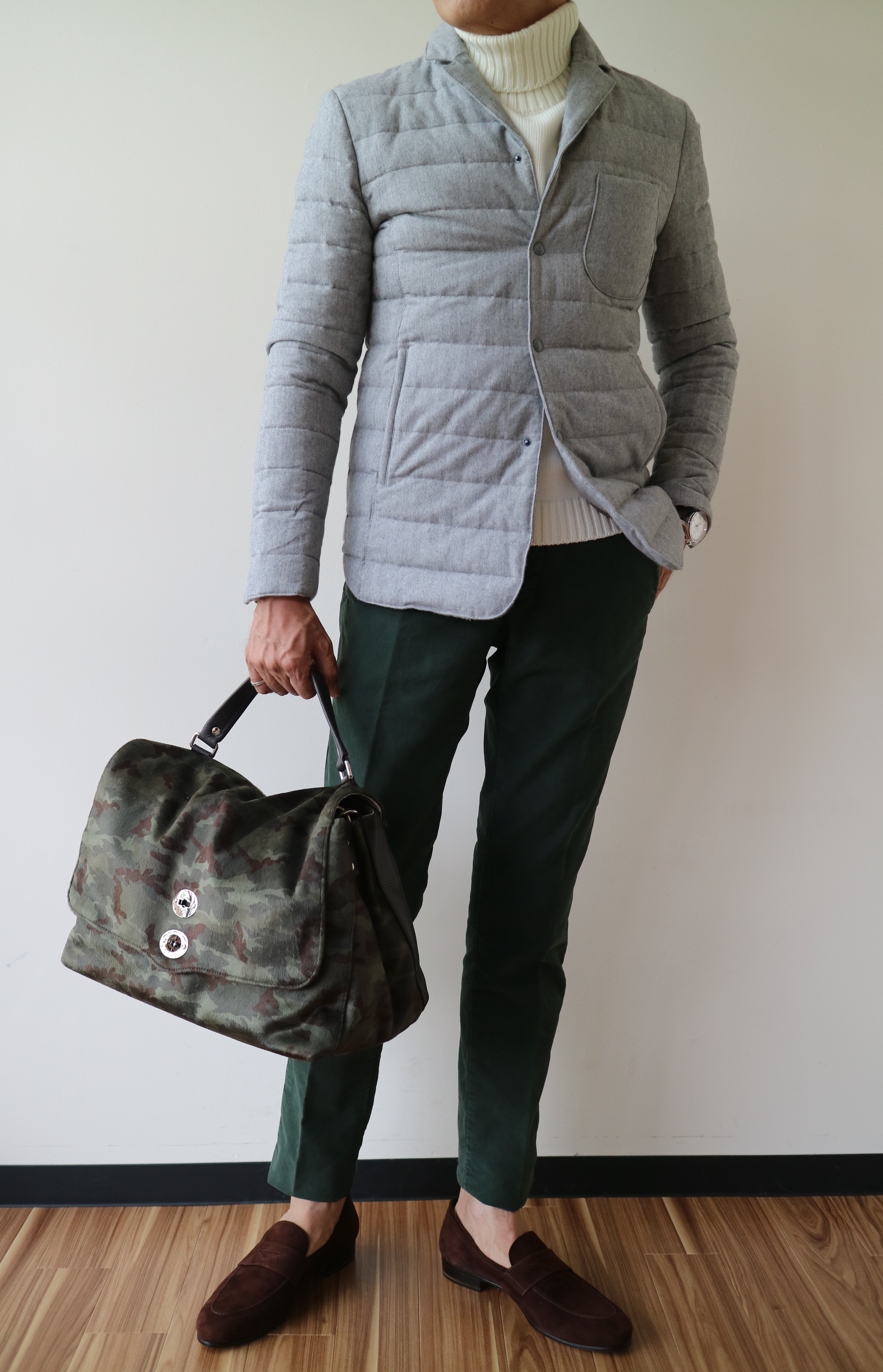 合わせたニットは未公開のGran Sasso、パンツはINCOTEX SLACKS、靴はWallly Walker、バッグはZANELLATOです。