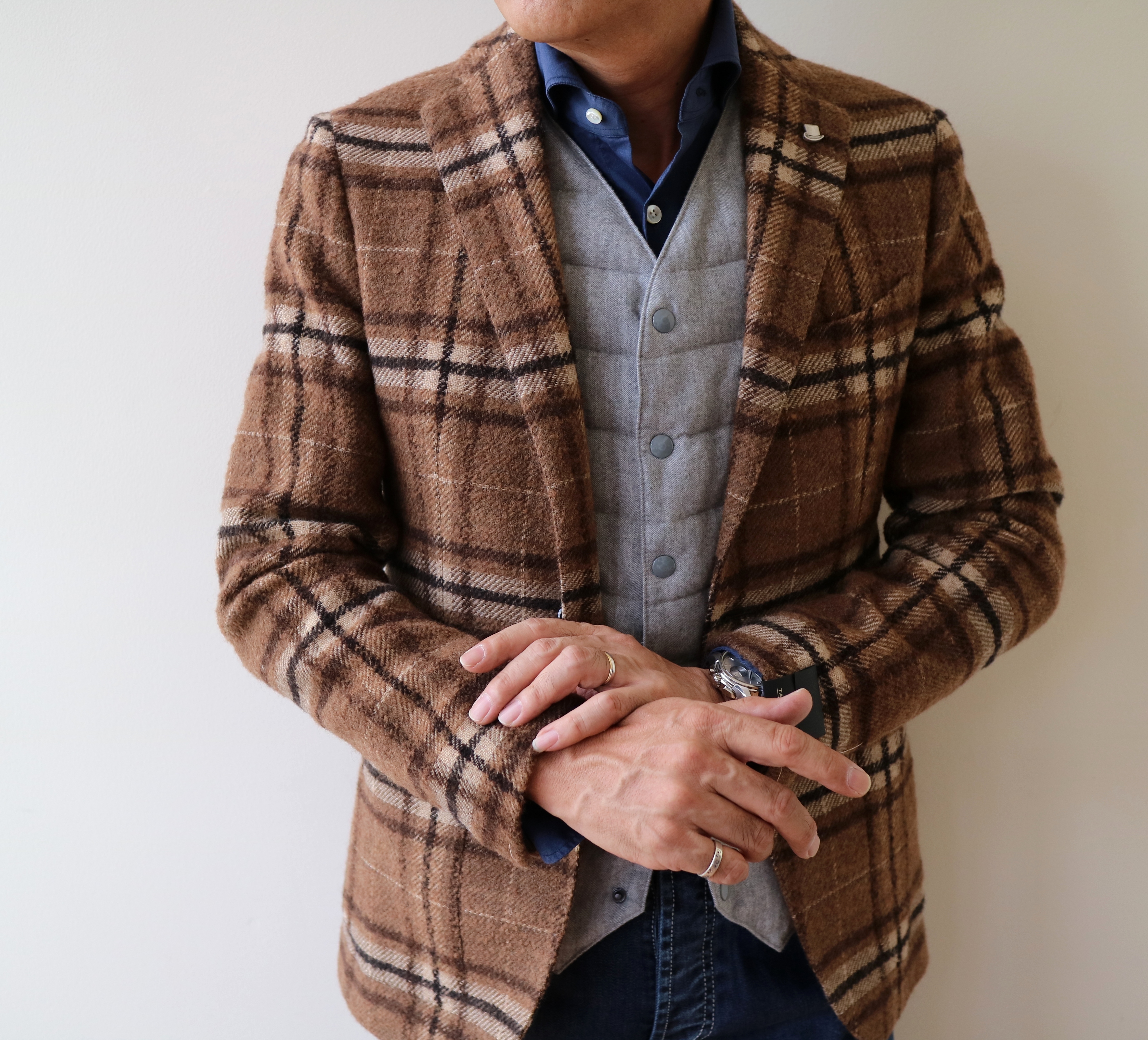 上の写真で合わせたシャツは、マガジーノで展開中のGiannetto、ニットは未公開のGran Sasso。下の写真で着ているジャケットはTAGLIATORE、シャツはBARBA、デニムはRICHARD J. BROWNです。
