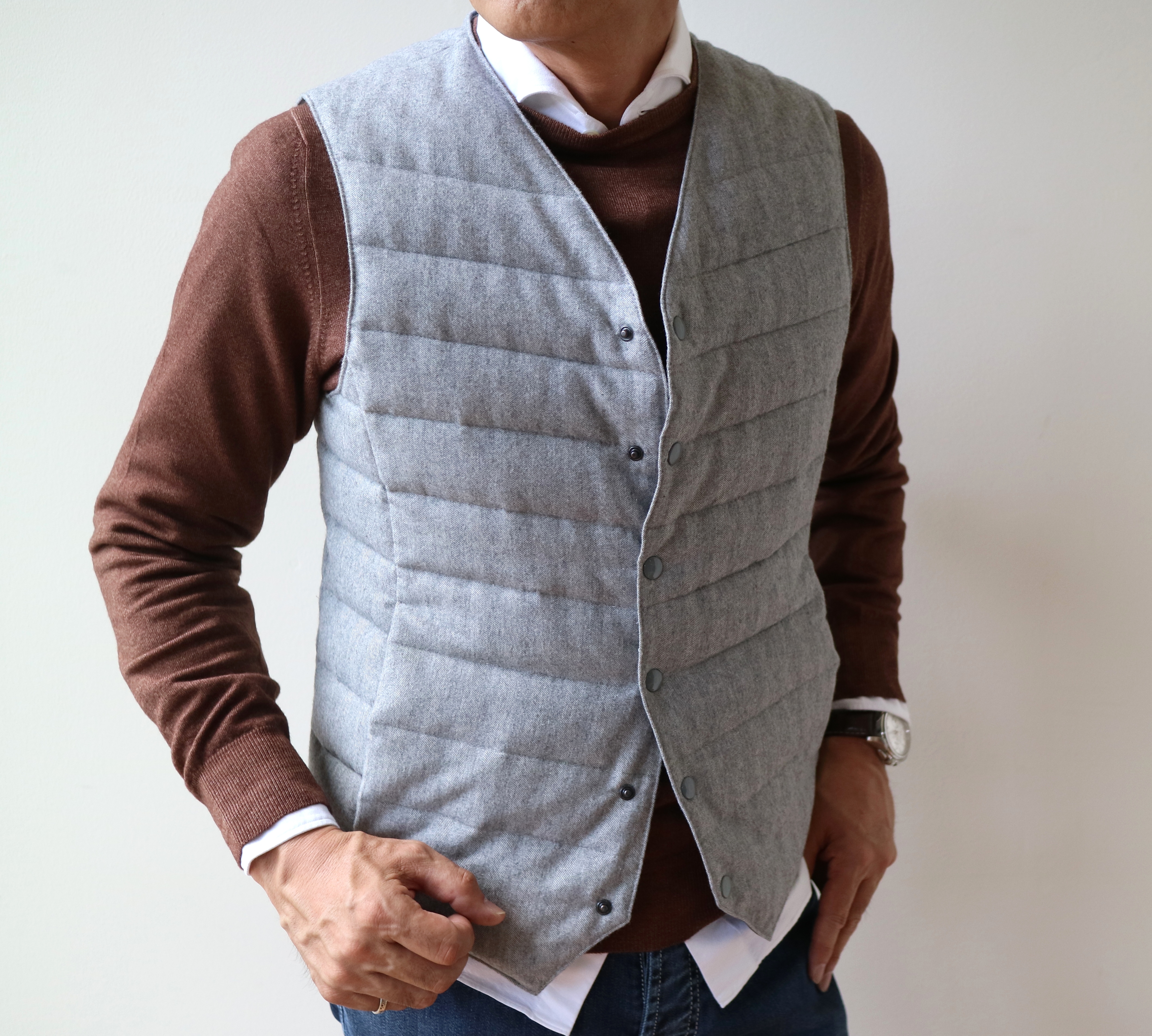 薄手のダウンベストの利点は、インナーにも使えること。建物の外は寒く、中は暖かい、そんな冬場にはジャケットやコートとシャツの間に挟んでやれば、ちょうど良い防寒着として活躍しそうです。無彩色のグレイならコーディネートの邪魔にもなりません。
