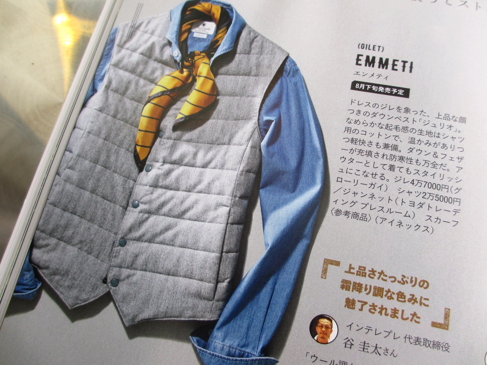 今月発売のMEN'S EX9月号(来月号は、いよいよ"お洒落道場"に登場です)、P103に掲載の【EMMETI/エンメティ】のダウンベスト「GIULIO/ジュリオ」。クレジットにグローリーガイの名があるだけに責任重大です。しっかり、ご案内します。