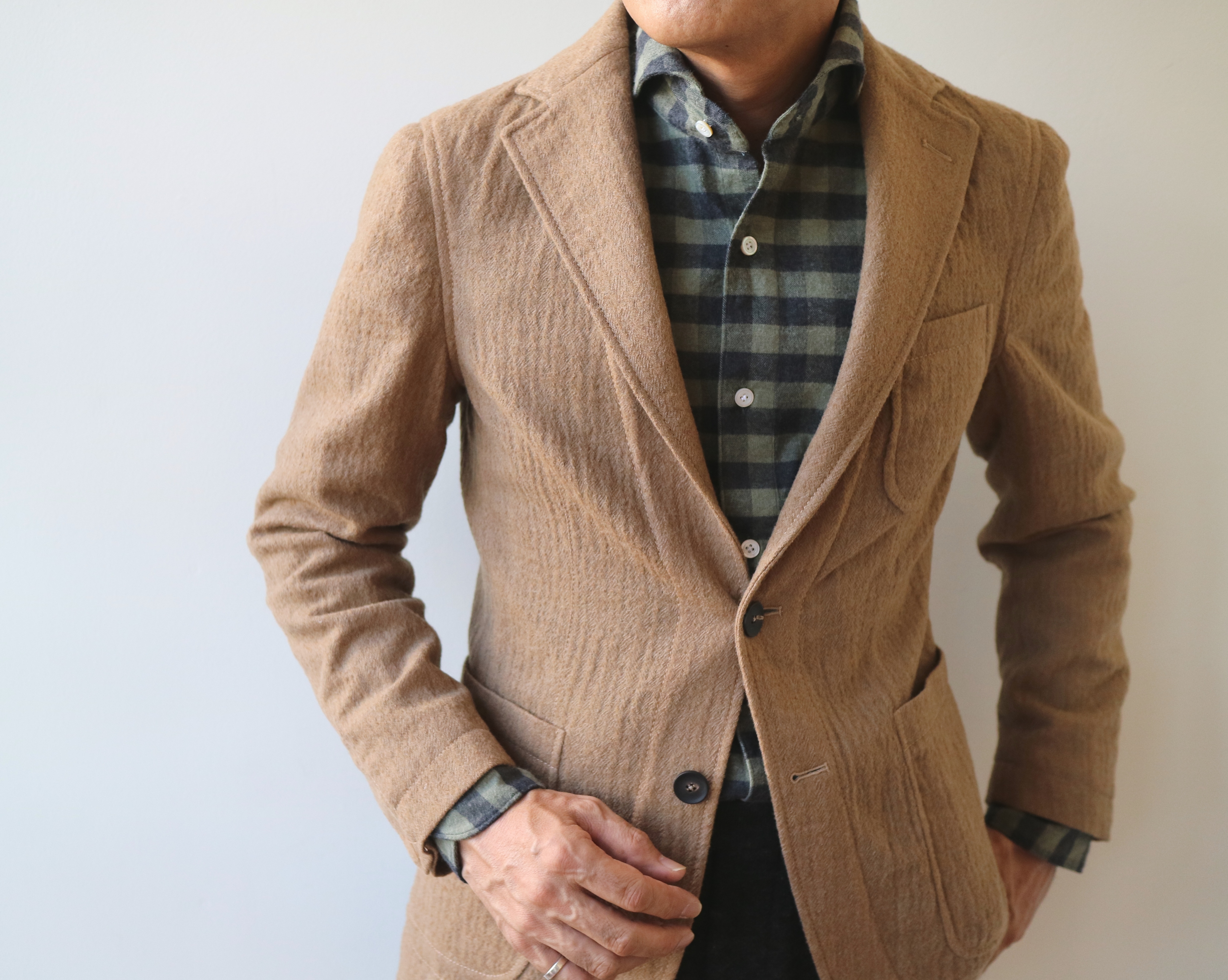 ウールに洗いをかけたような(実際にかけているのかもしれません)くたり感が、新しいのになぜか遠い懐かしさを感じさせてくれます。インナーにシャツを合わせさせたのも、そんな郷愁からかもしれません。