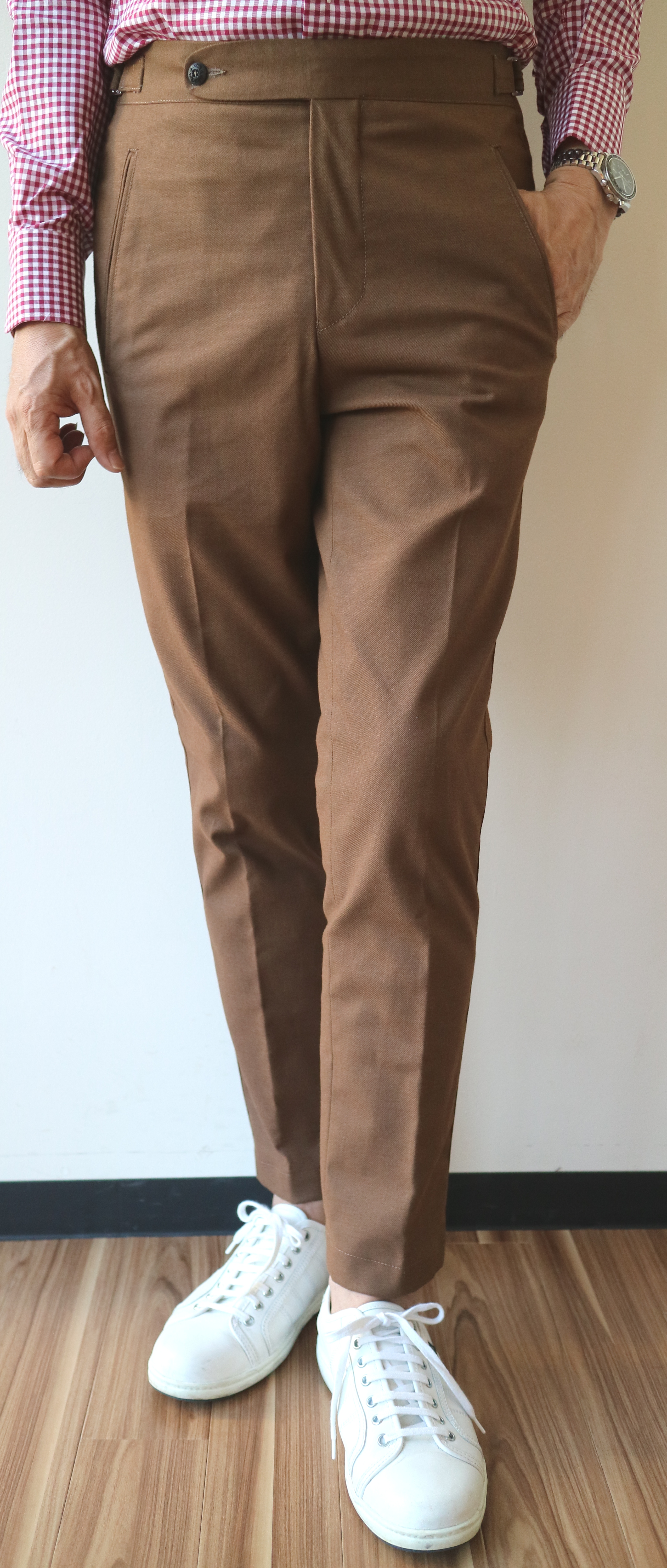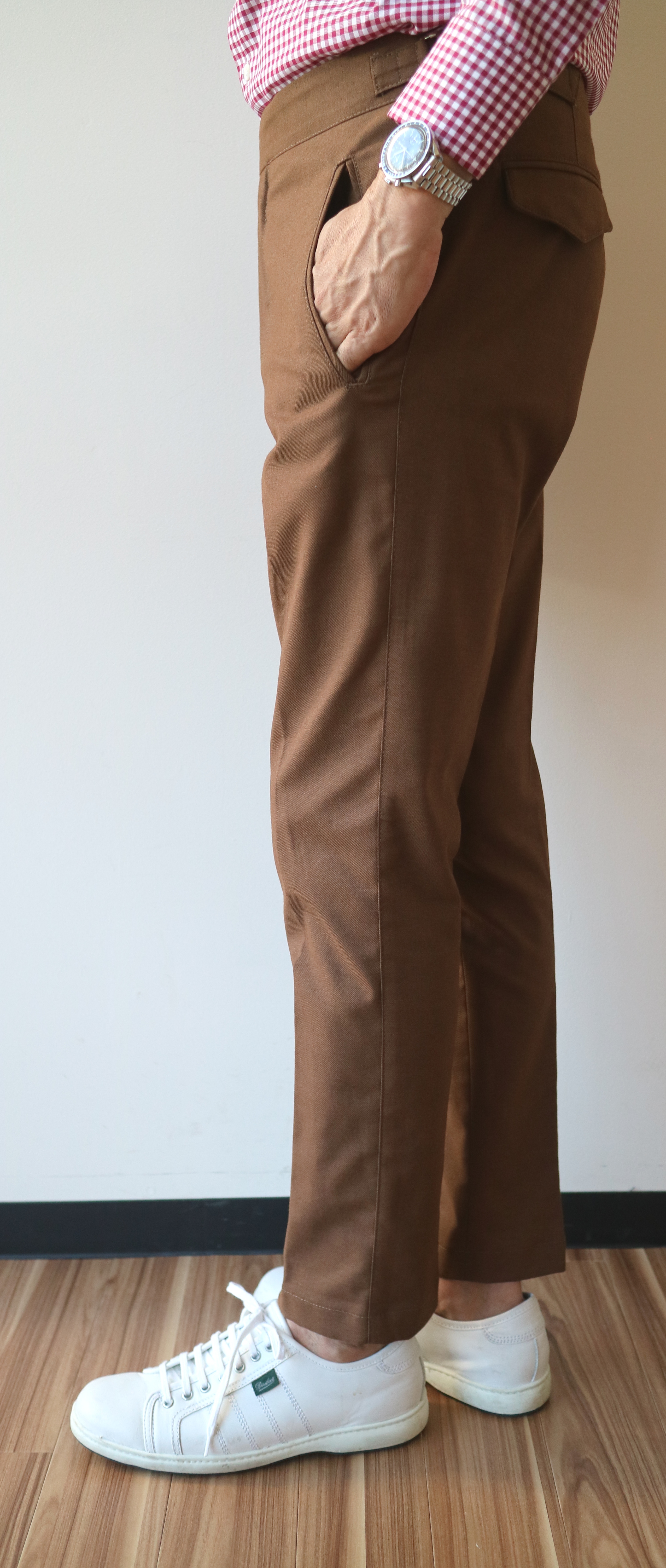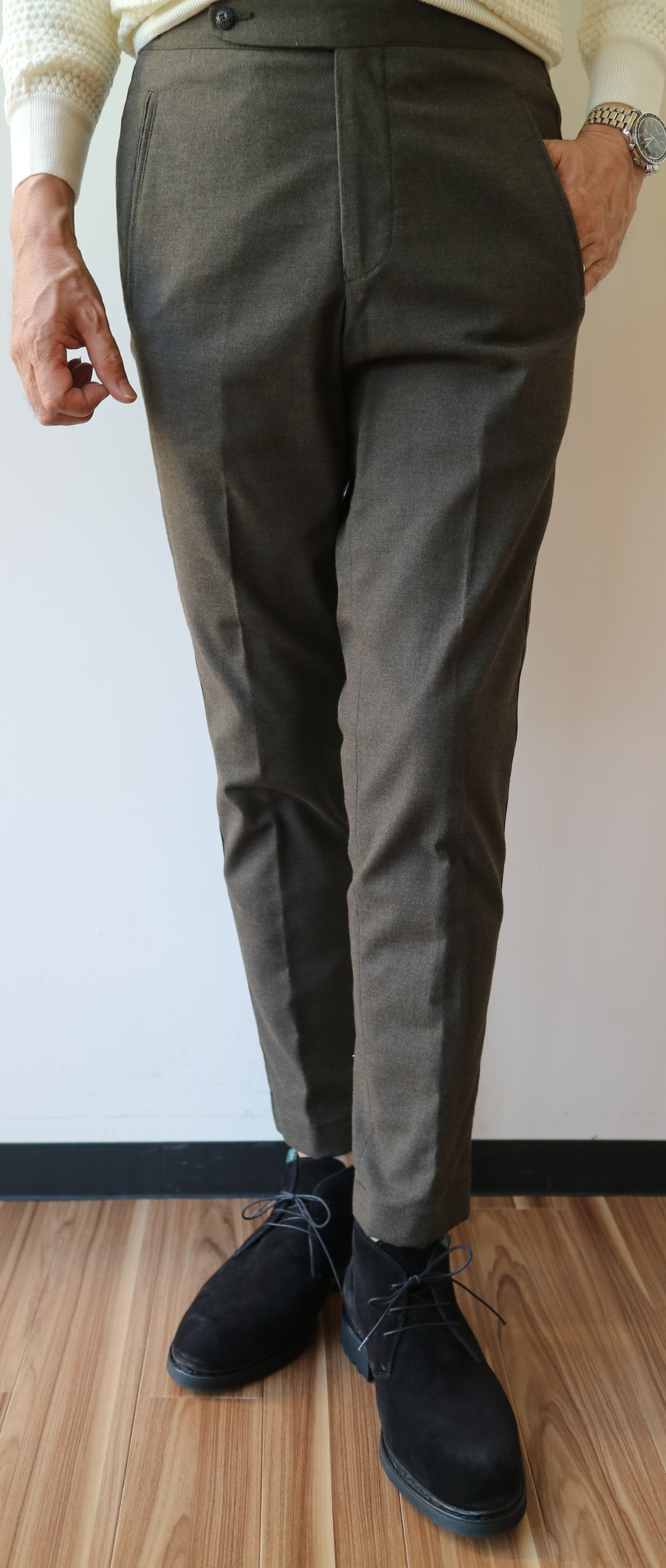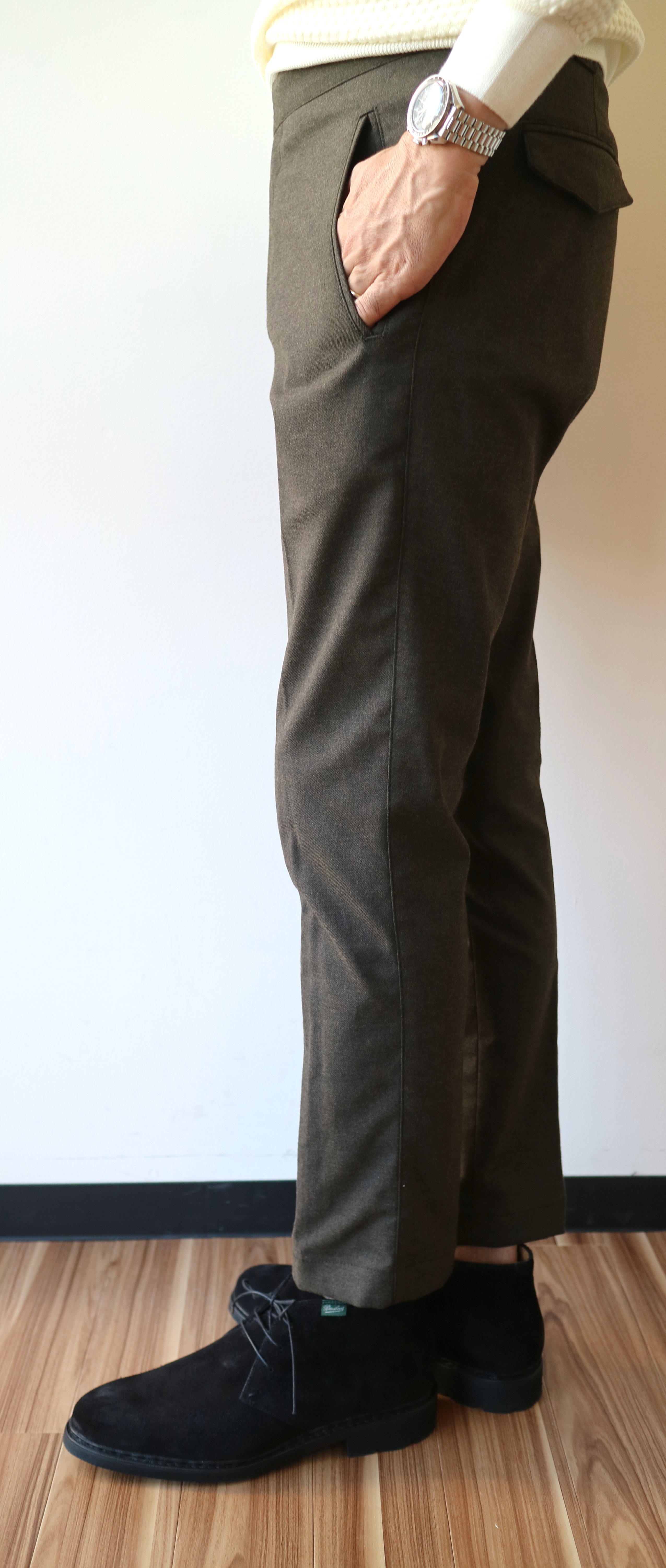 迷わずセレクトしたモデルは、新型の「ATKA」。サイドに尾錠の付いたベルトレスモデル。バックの深い切り込みは、ブレイシーズ(サスペンダー)を吊る為の仕様です。代表するパンツモデル「TONGA」と比べ、細身のテーパードラインは、クラシックでもありモダン。美しいフォルムをもつ、今季、お勧め=欲しいパンツになりそうです。