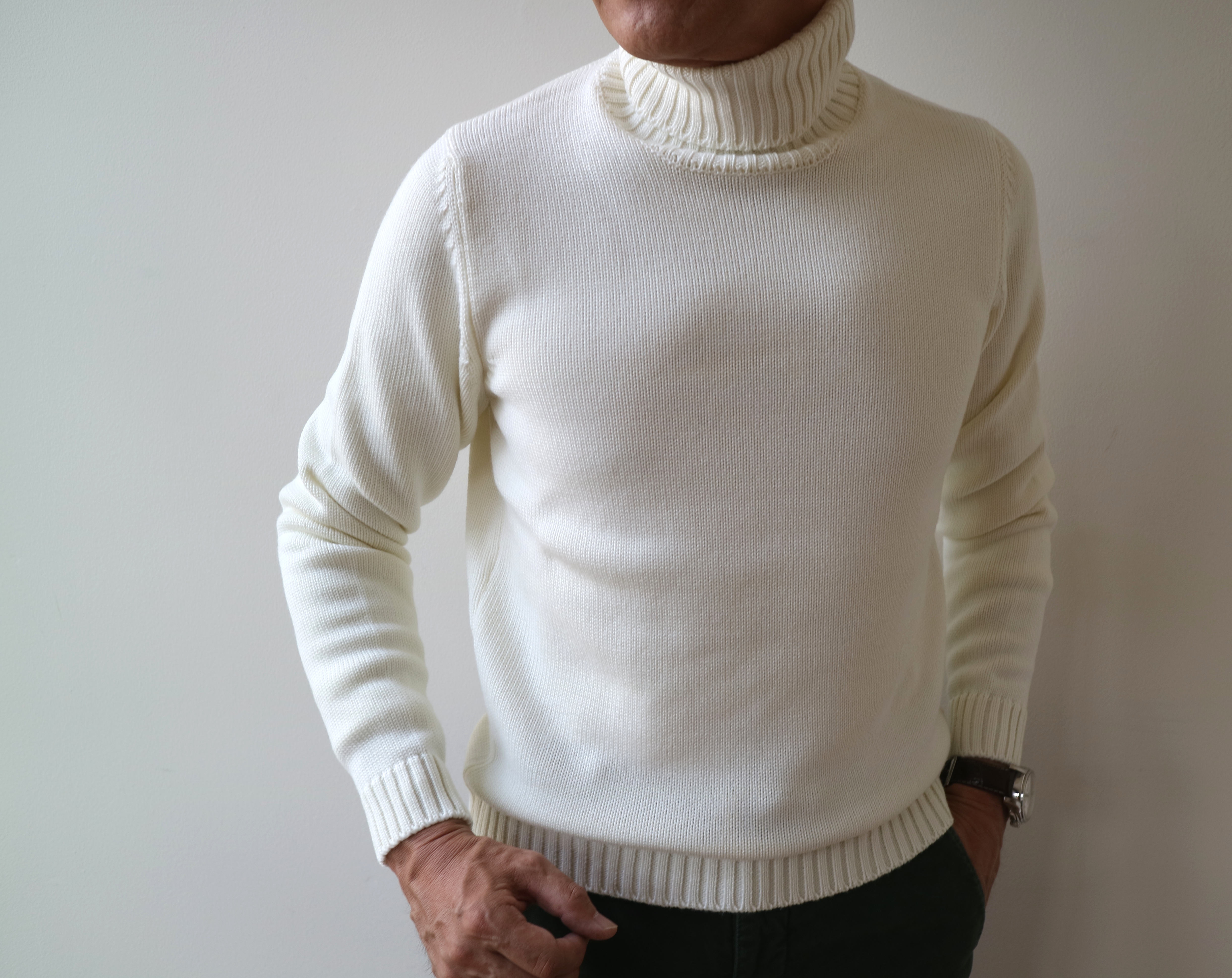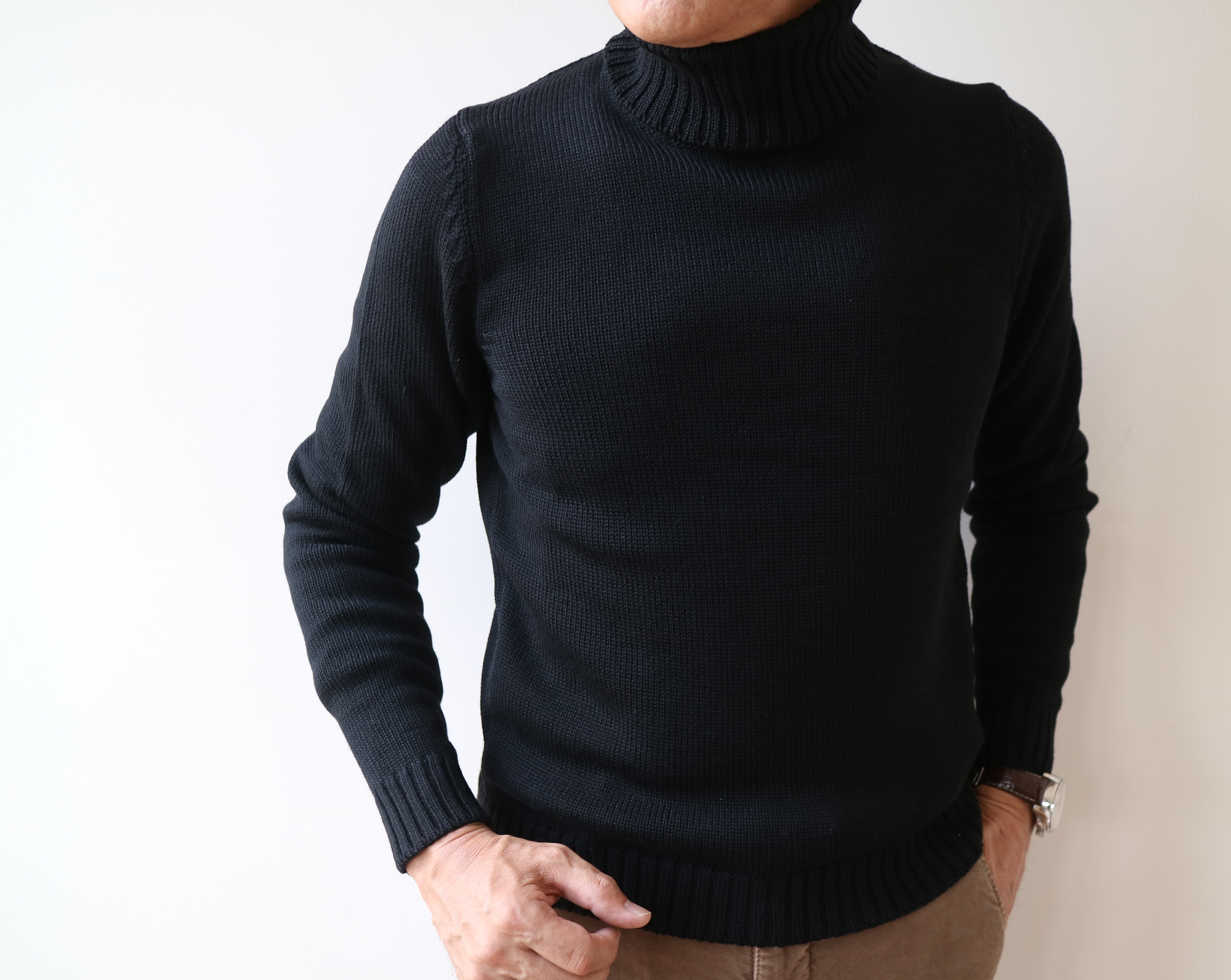 最後にお馴染みミドルゲージのタートルネック。もう何年も継続している定番の中の定番です。今季は、LATTE/ラテ、GLIGIO CHIARO/ライトグレイ、NERO/ブラックの3色で展開。欲張りすぎるのは、やめました。
