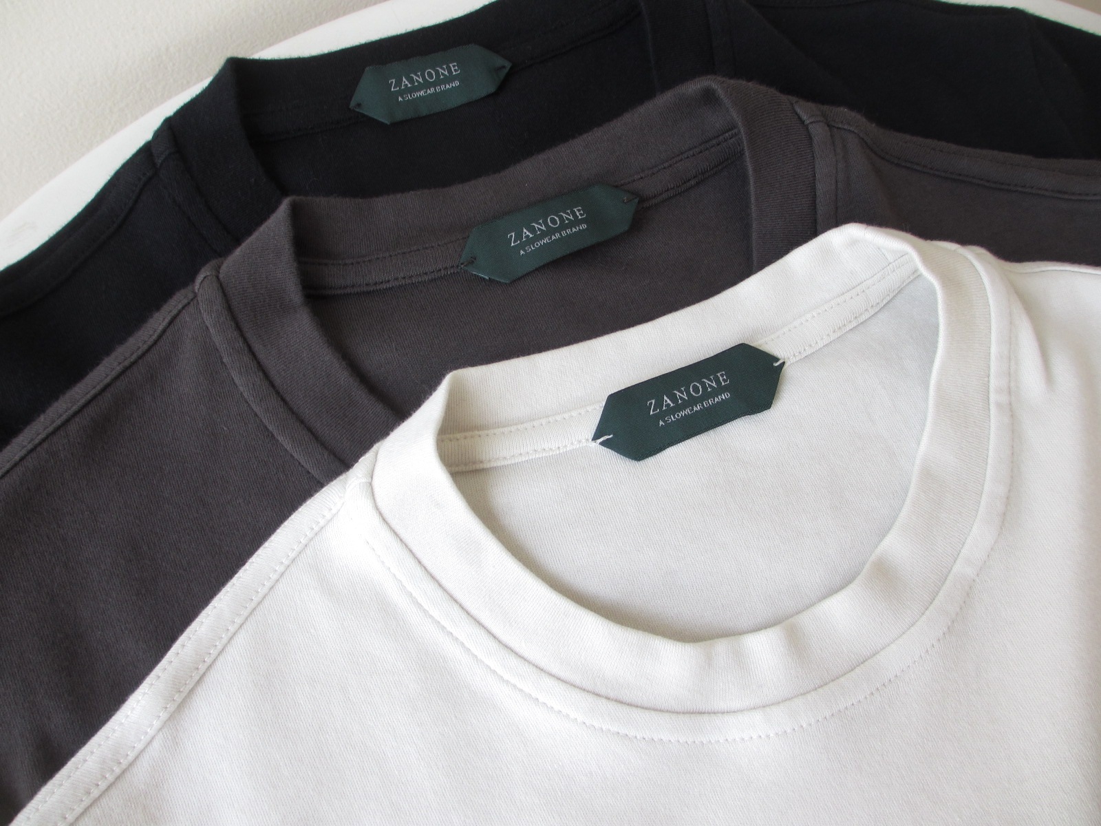 昔から、ザノーネカラーと呼んで、色目を説明するのが難しい【ZANONE/ザノーネ】。上から、GRIGIO CHIAROは明るいグレイという意味ですが、オイスターグレイにします。そしてMORO。ブラウンですが、光によってはグレイがかって見えます。NEROは説明要らず、ブラックのことです。