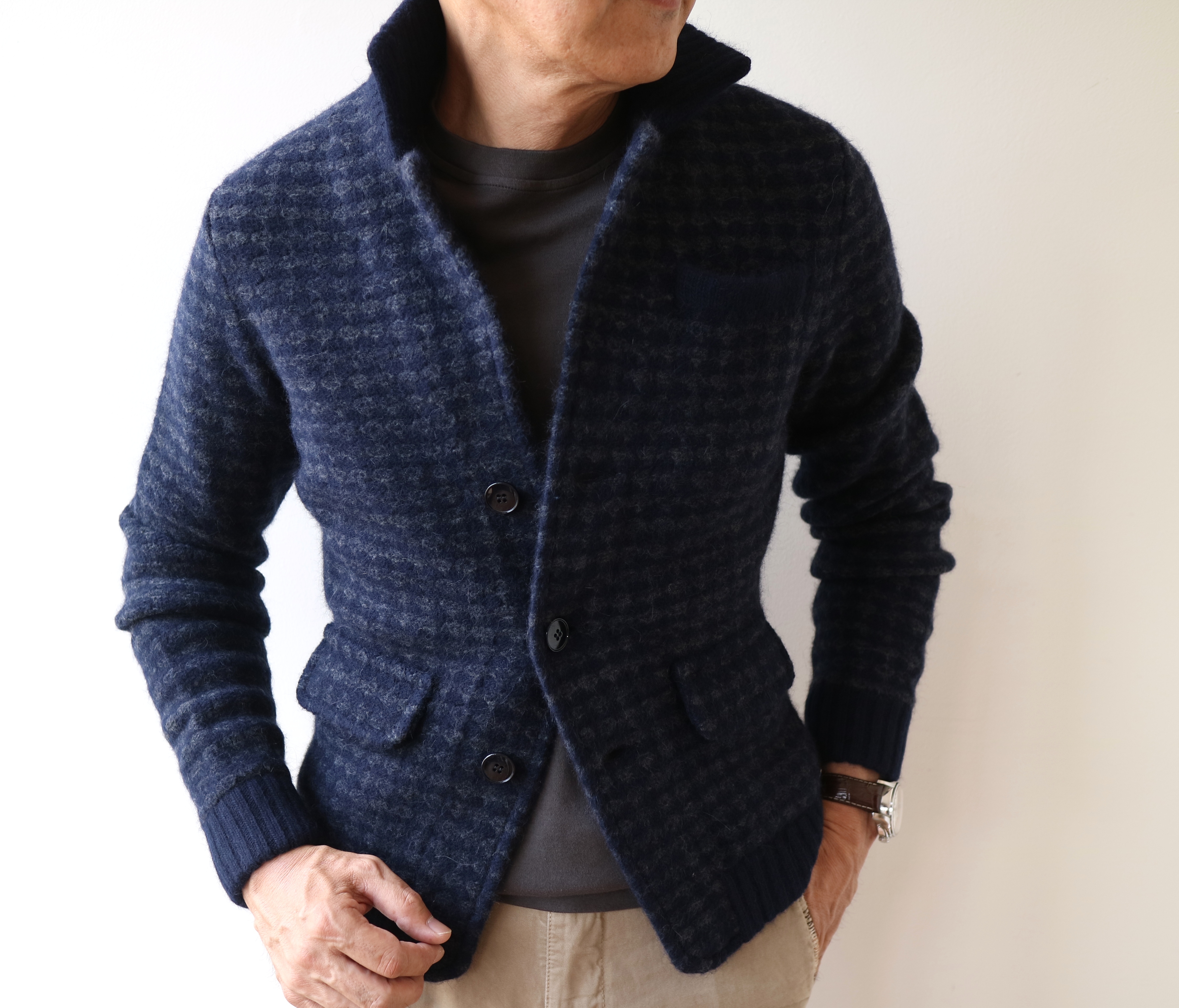 ジャケット型フロントのスマートさ、襟と袖、裾口がリブになっているブルゾンの機能性。その両方を兼ね備えたニットジャケットは、絶妙です。着てるうちにジワッと馴染んでくるコンパクトな作り。保温性のある素材と編地は、真冬でもドアツードアならコート無しで済みそうです。