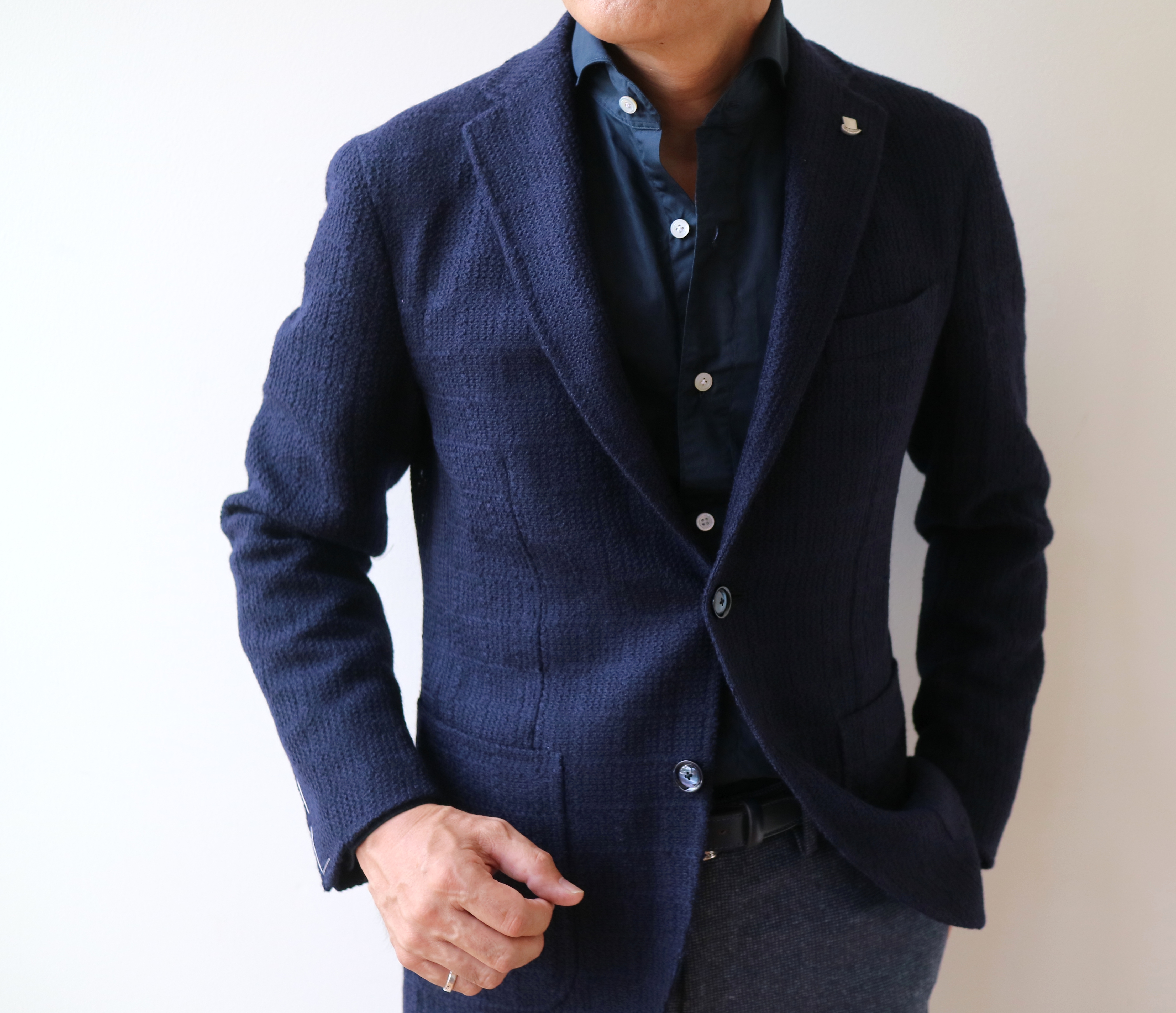 まるでニットのようなウール100%のネイビージャケット。編地の変化で格子柄に見せているのが、特徴です。ニットのような優しさとテーラードのもつ端正さ。いいとこ取りの女子受け間違いなしのジャケットに仕上がりました。着るシーンの多さやコーディネートの幅広さは、ネイビージャケットの魅力でしょうか。