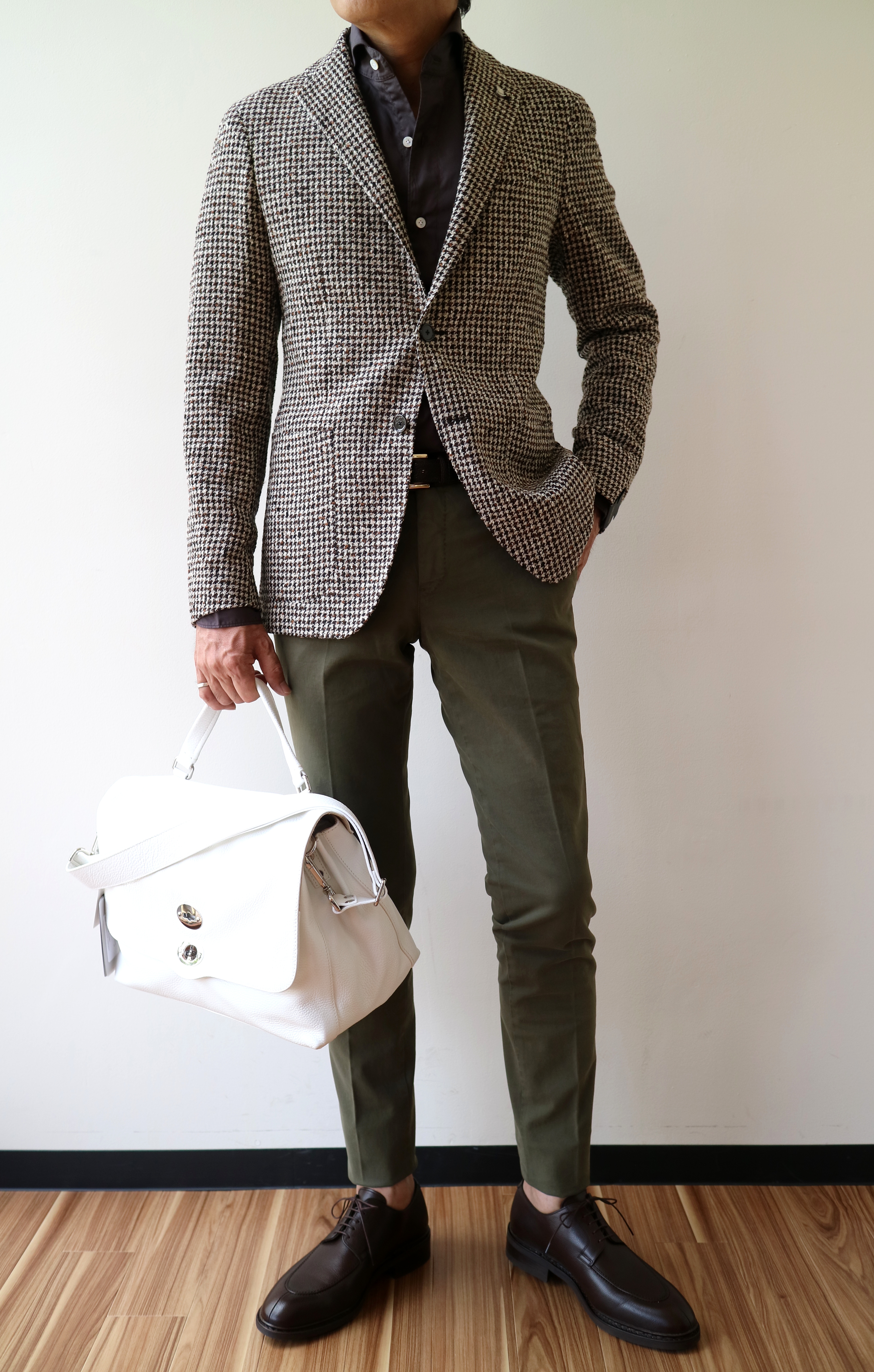 合わせたシャツはFinamore(未公開)、パンツはPT01、ベルトはTIBERIO FERRETTI、靴はParaboot(私物)、バッグはZANELLATO(未公開)です。