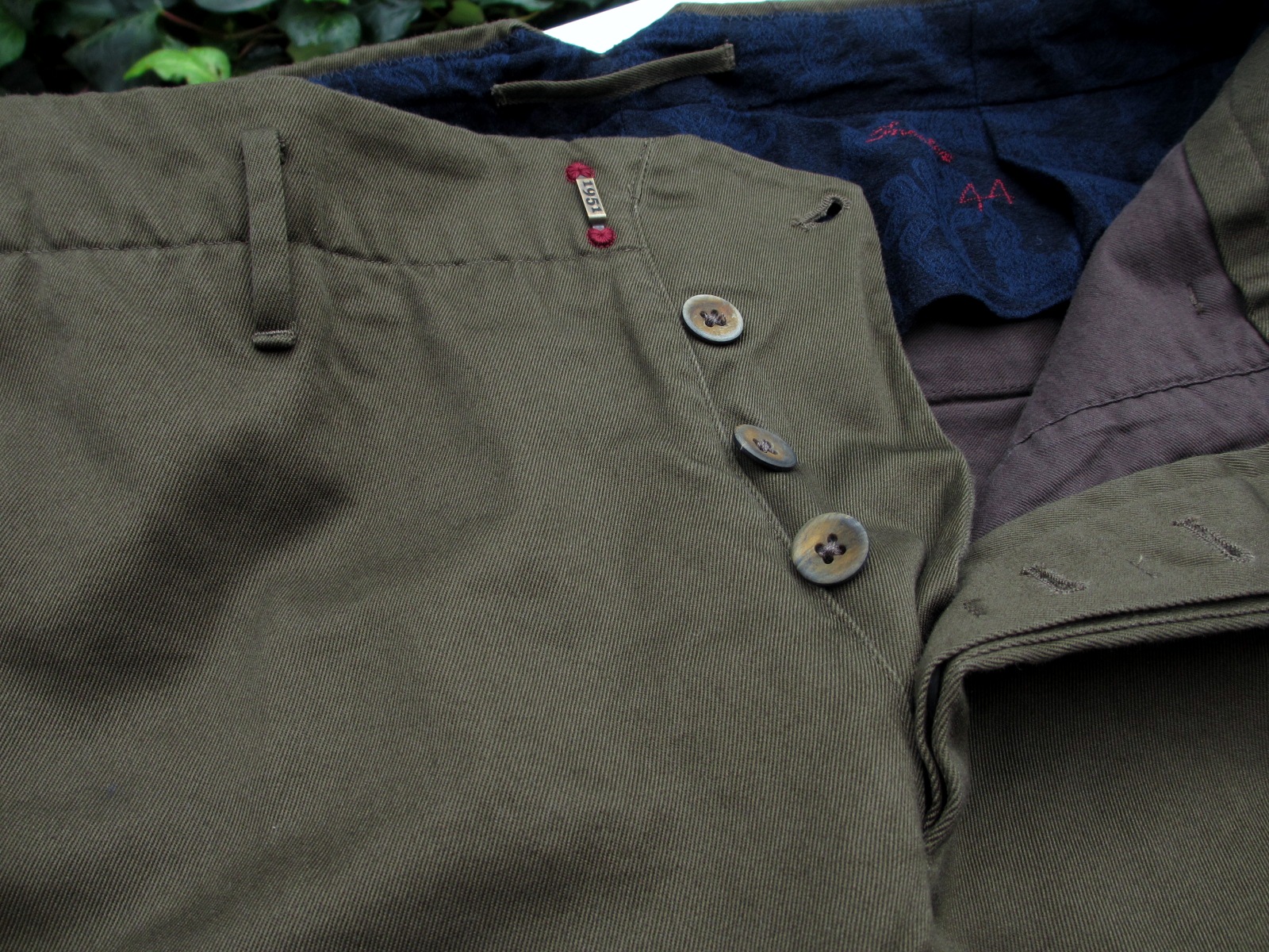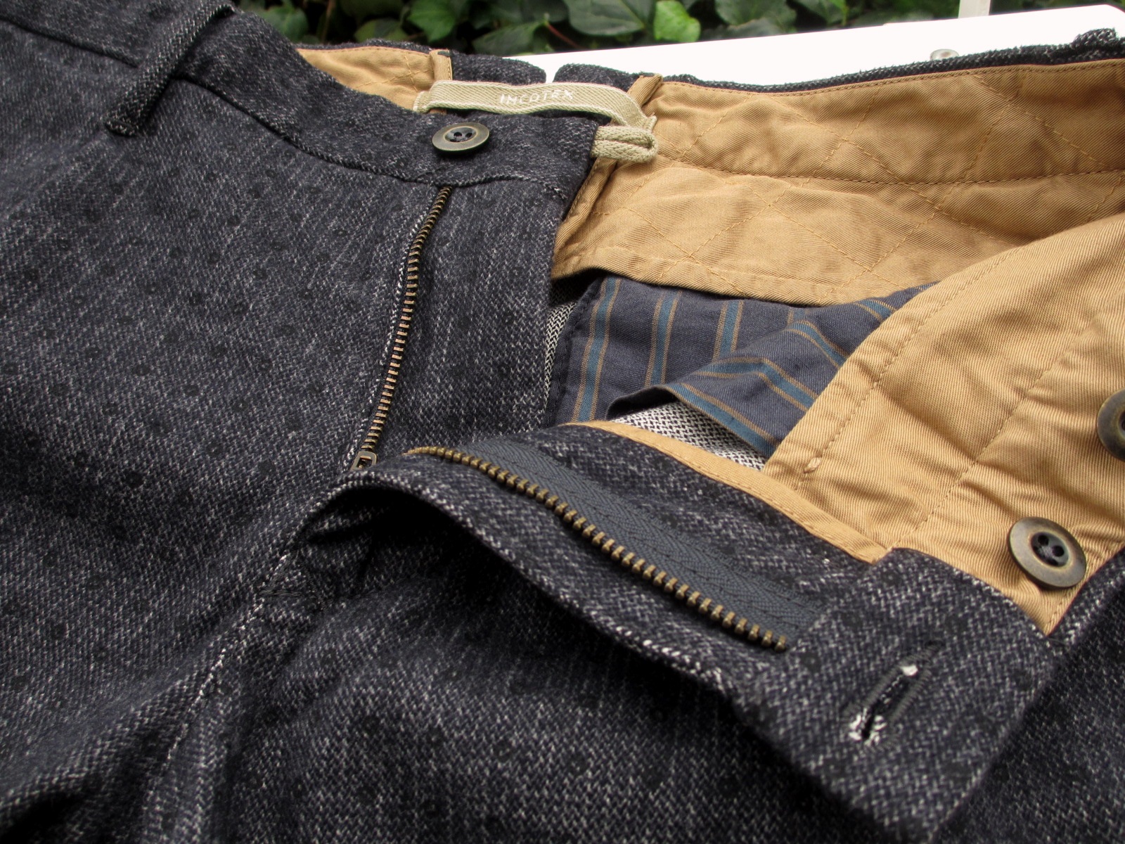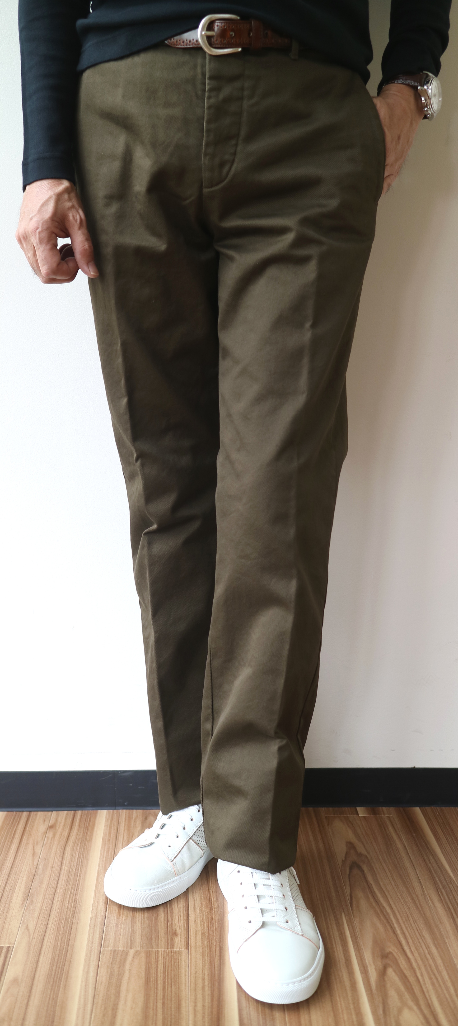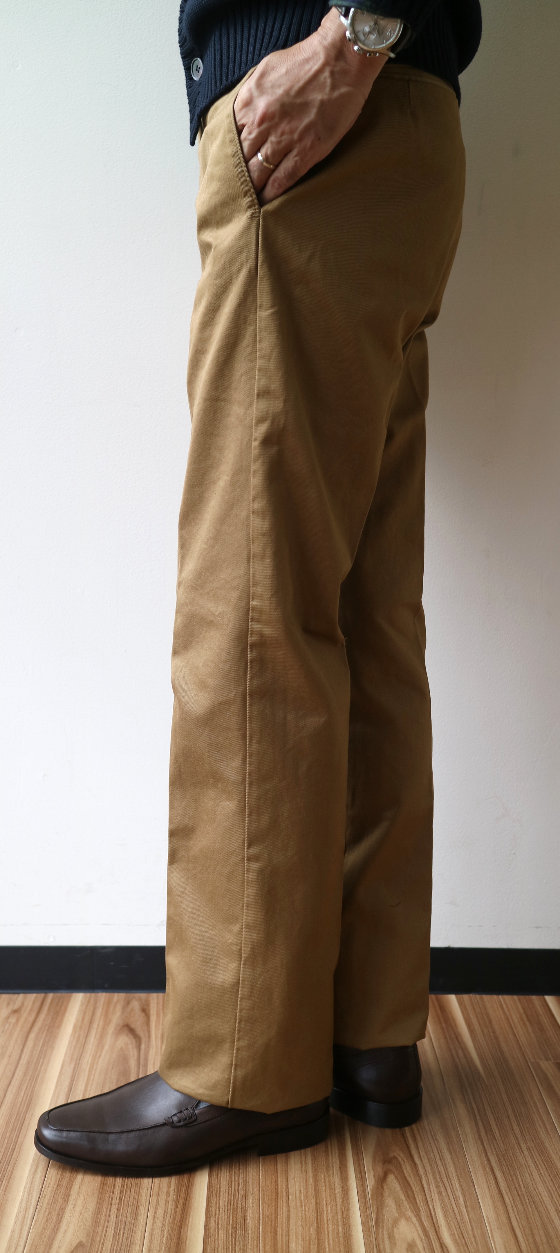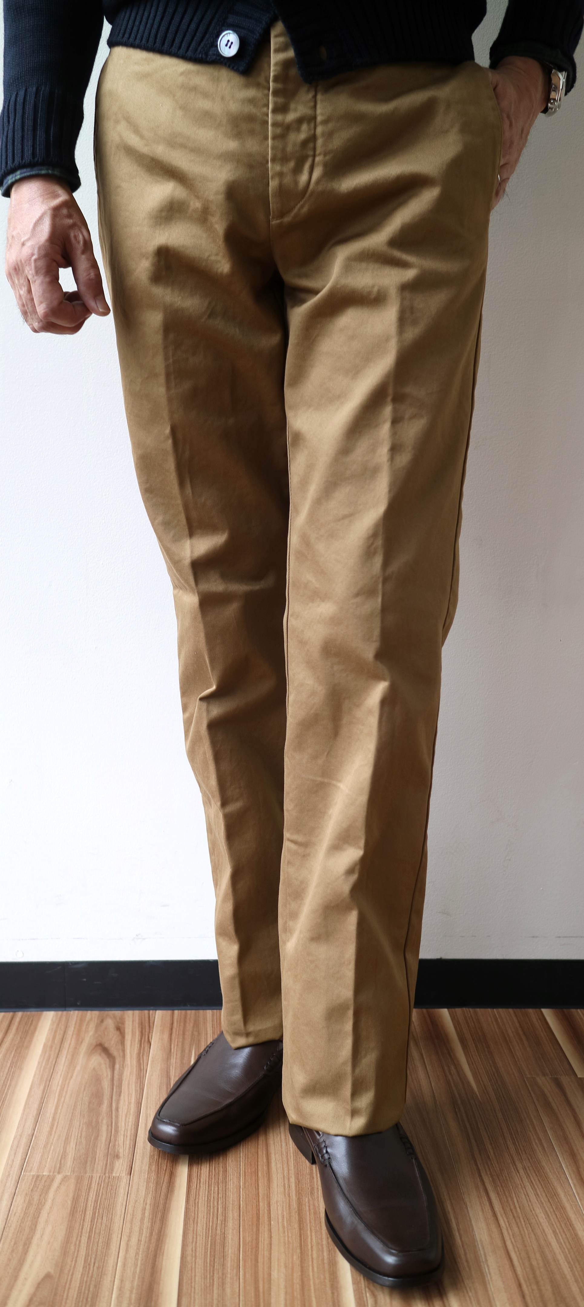 糸染めのコットン・ポリ・レーヨンに1%のみポリウレタン素材。伸縮性は、さほどありませんが、ジワッと馴染んでくる温かみのある生地です。注釈に「GENTLEMAN CHINO」と記されていました。紳士のすっきりパンツです。