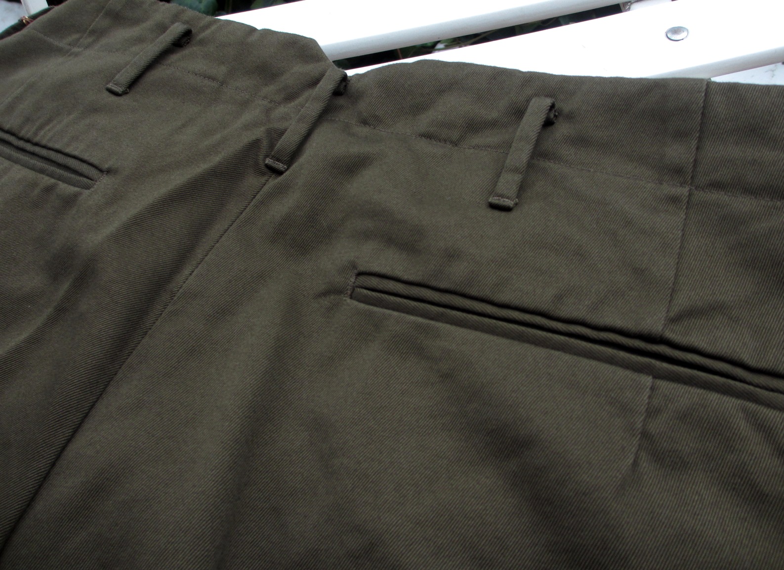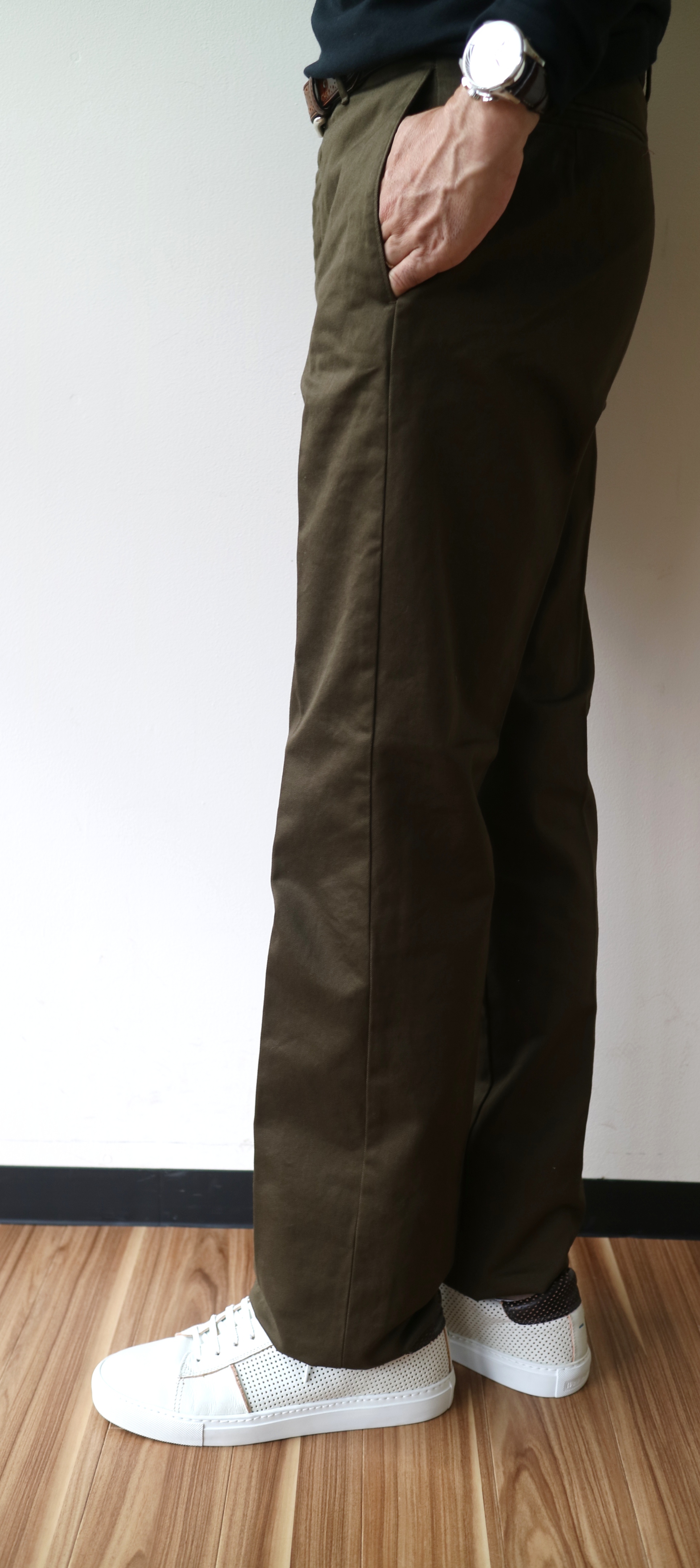 コットン100%の綾織りは、PIECE DYEDという後染め。糸の段階で染める先染めと比べると、素朴な質感です。穿き込むほどに馴染んでいきます。カラーは基本色のベージュカーキとオリーブグリーン。どちらも揃えておきたい色目です。