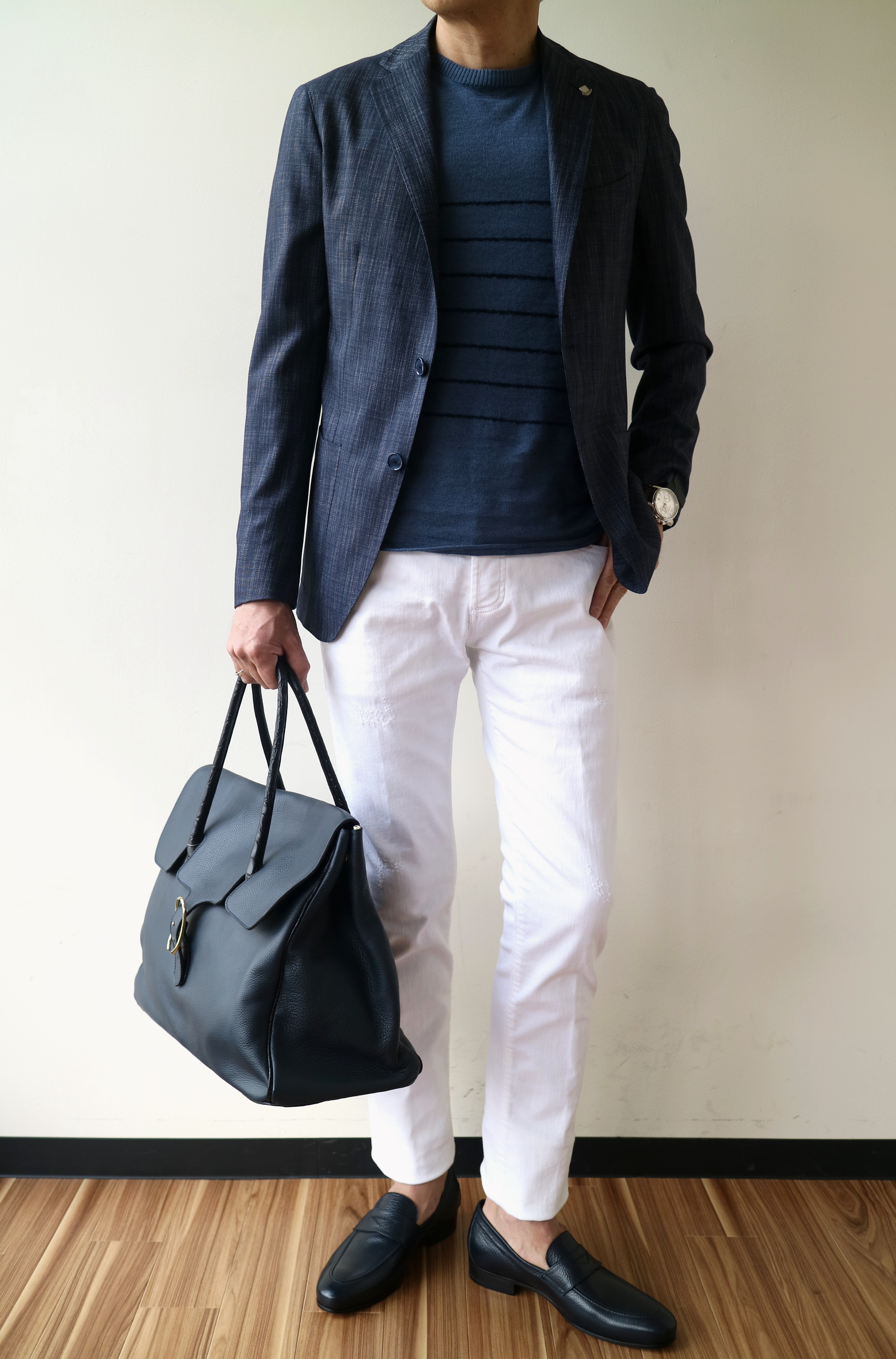 ブルーで合わせたジャケットはTAGLIATORE(未公開)、パンツはRICHARD J. BROWN、靴はFERRANTE、バッグはCISEI。ブラックで合わせたパンツはPT01(未公開)、靴はFERRANTEです。