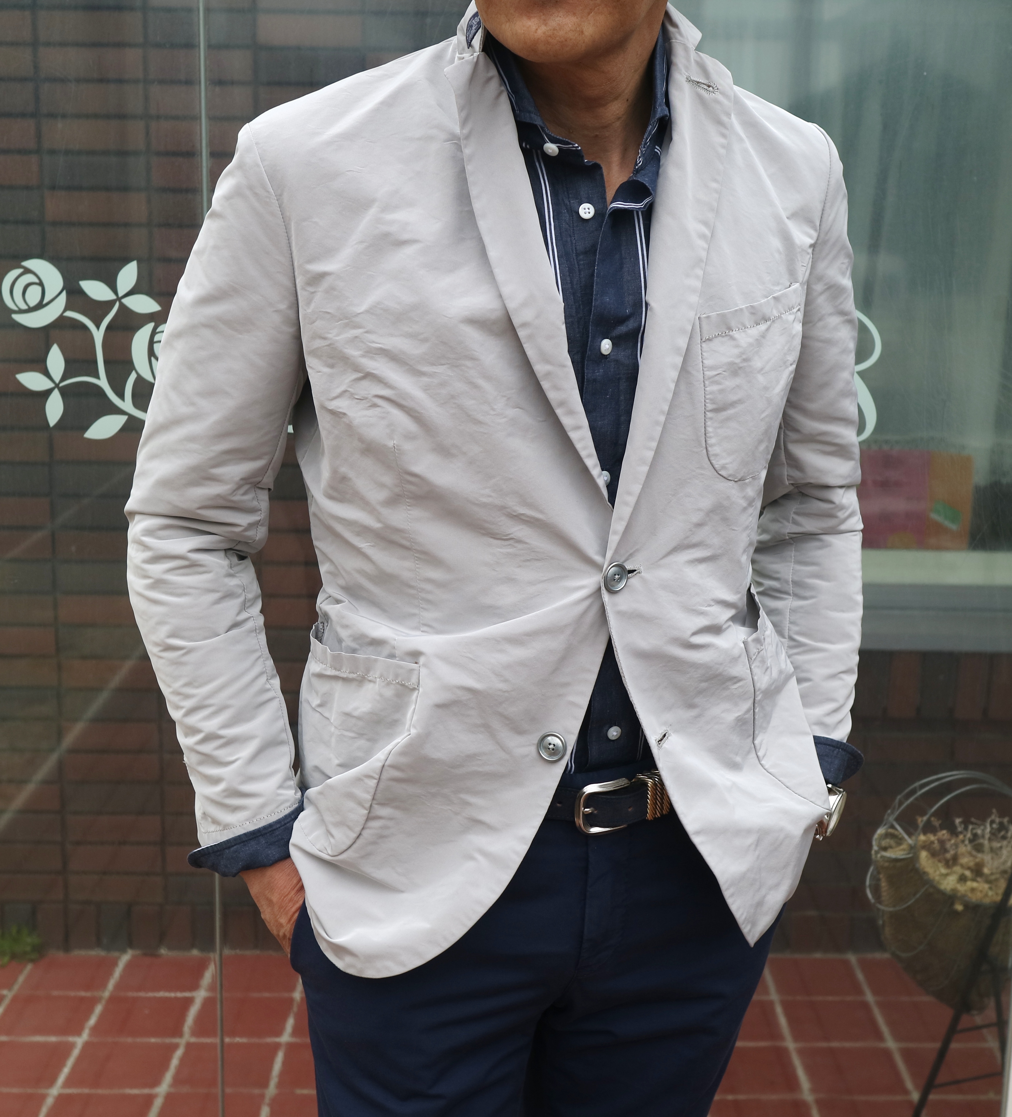 ジャケットとブルゾンの両方を併せ持った、いいとこどりアウターは、フロント2つ釦、3パッチポケット、サイドベンツの【AQUARAMA/アクアラマ】、お馴染みの定番モデルです。