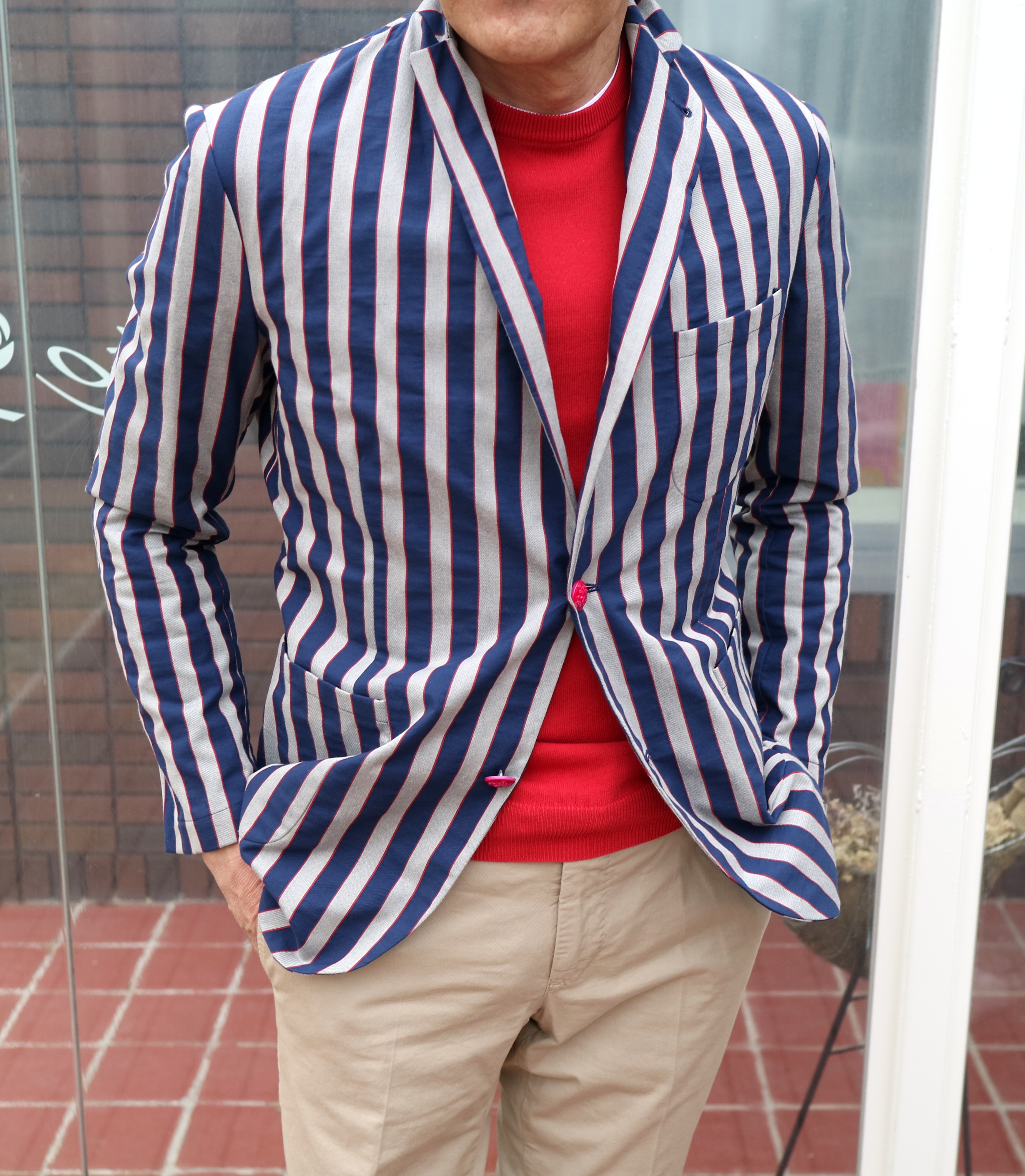 無地だけではね、ということでセレクトしたのはストライプ柄のクラブジャケット。上のと同型です。ホワイトを配したトリコロールではなく、グレイとネイビーをベースに控えめな赤のライン。落ち着いた雰囲気の柄行きですが、目立っているのは赤の釦でした。