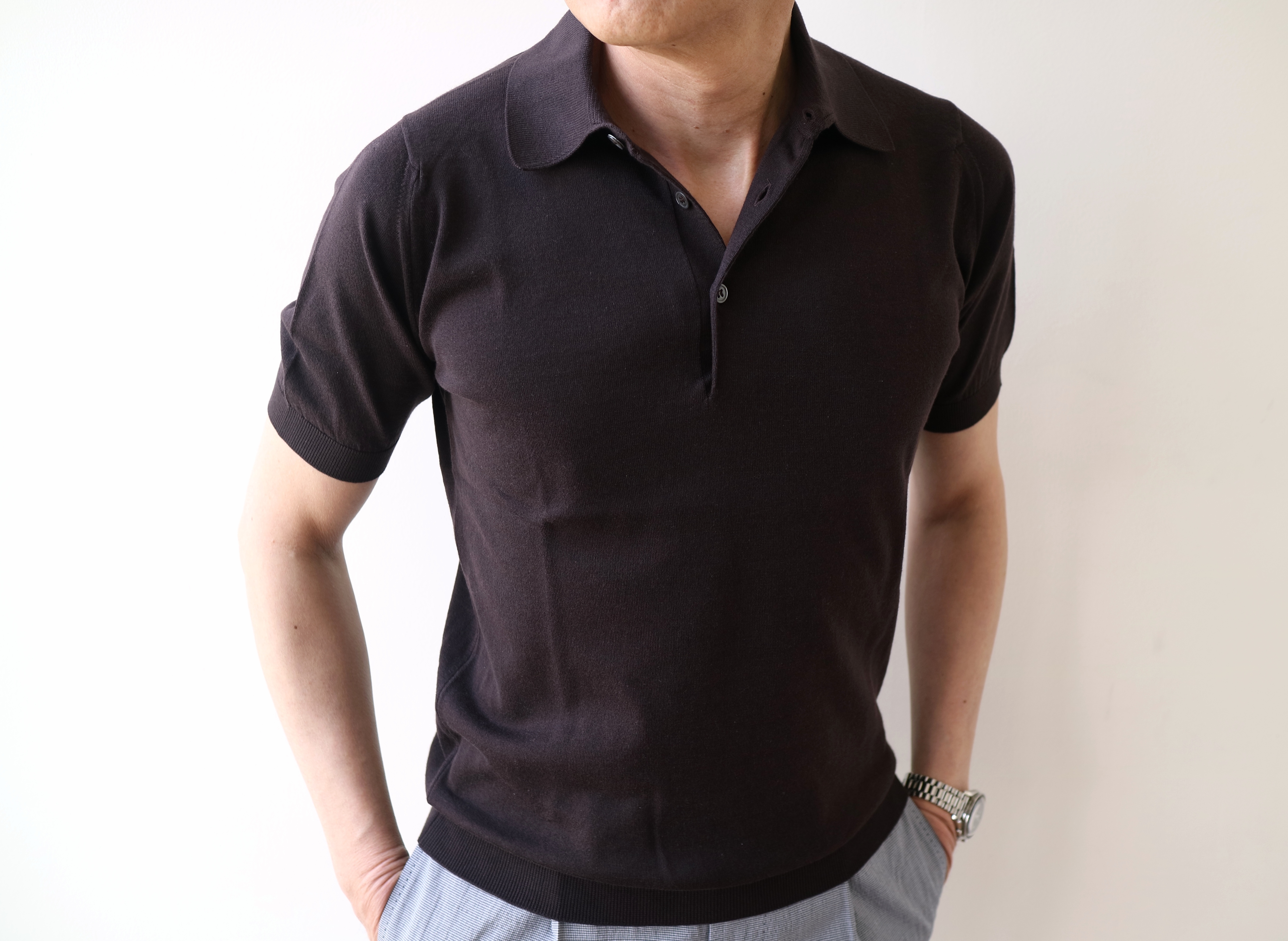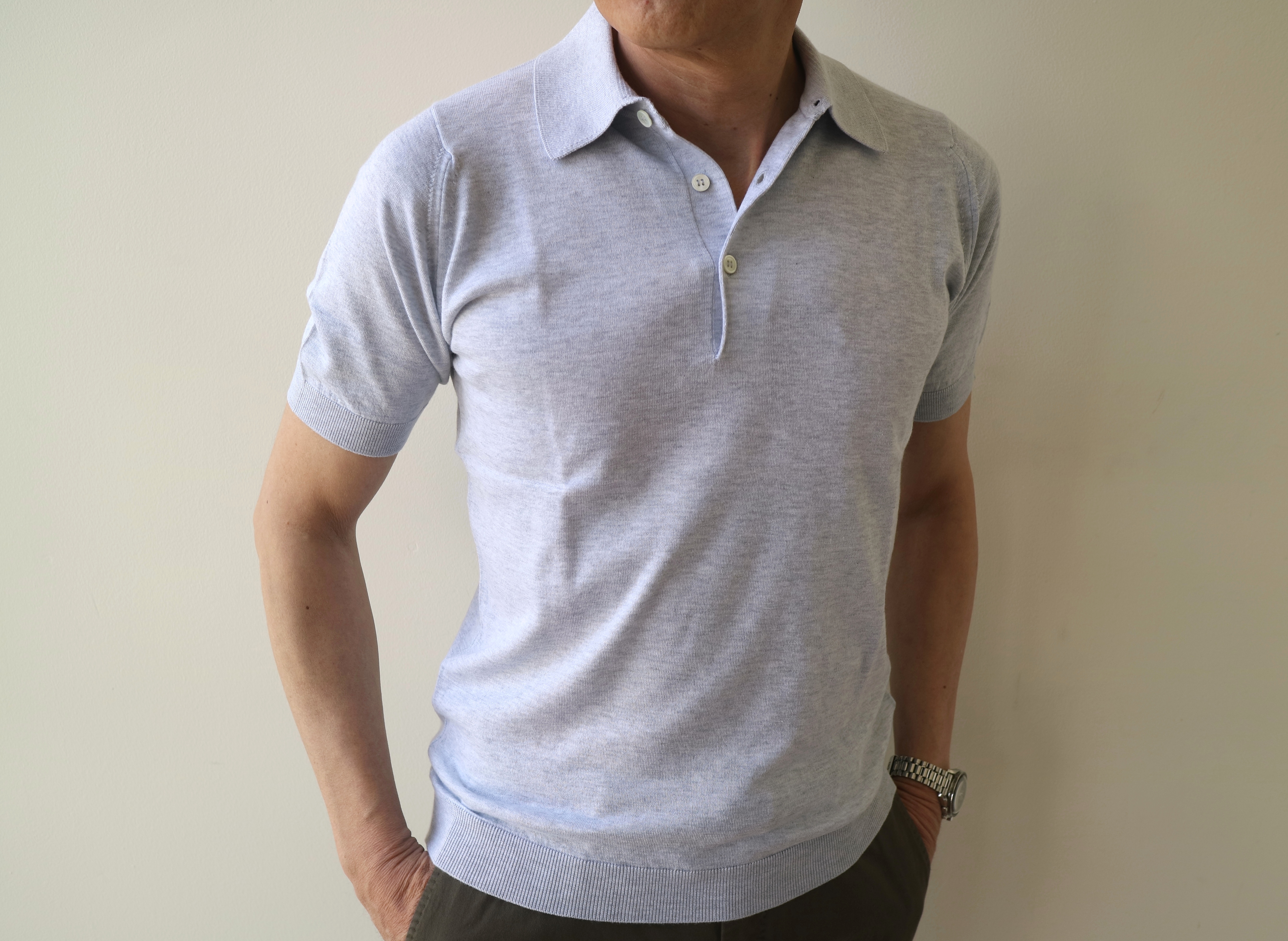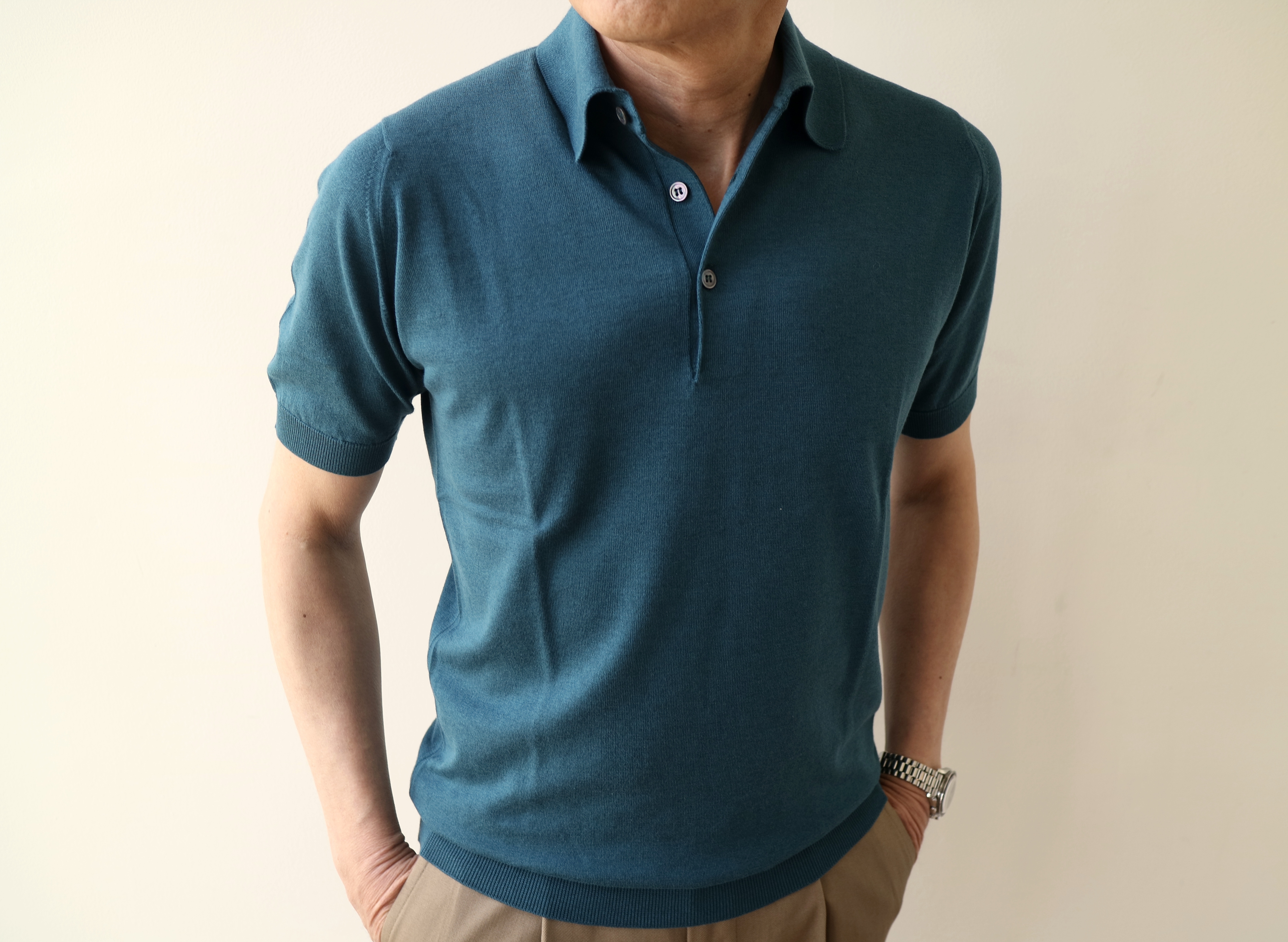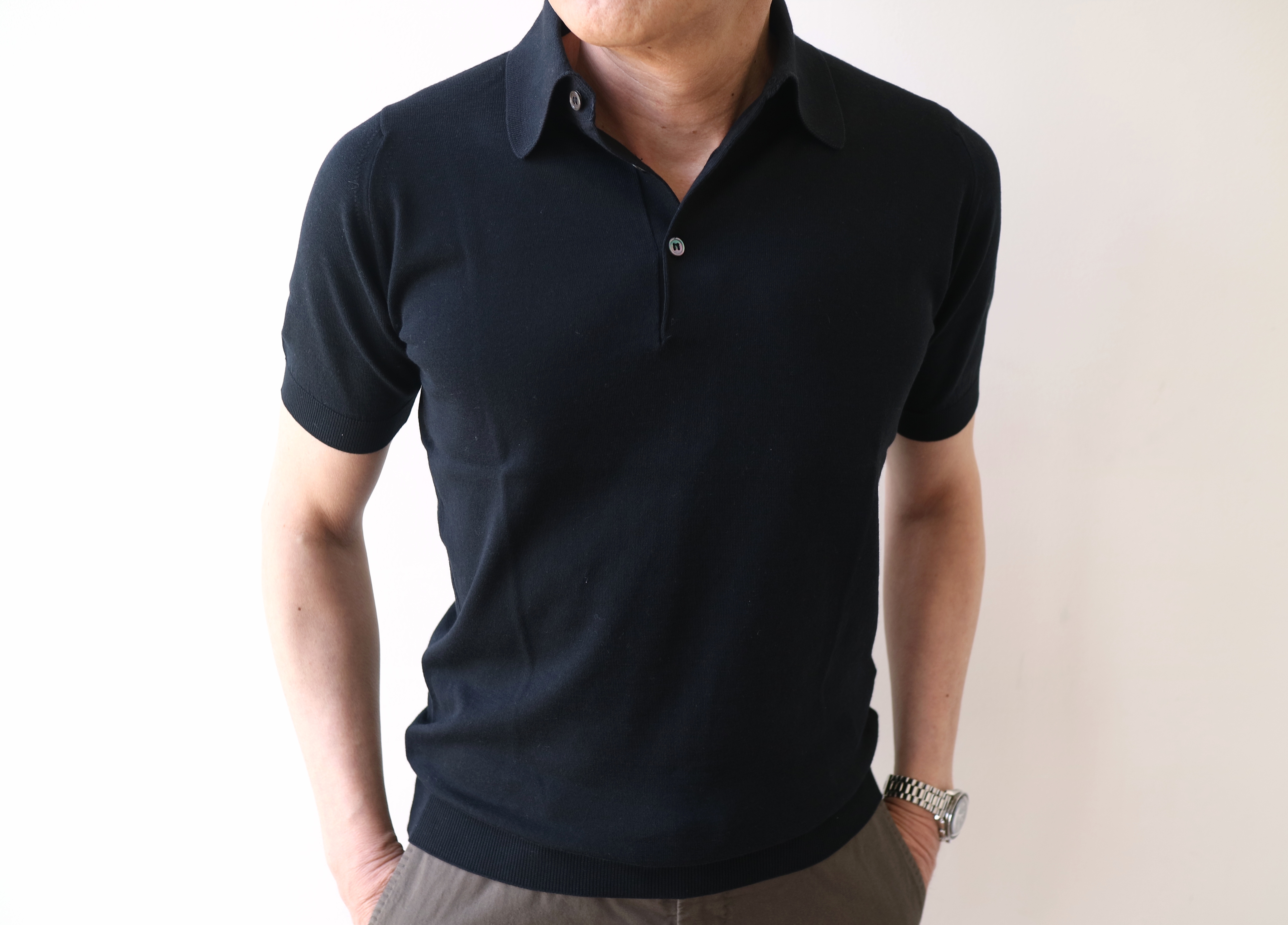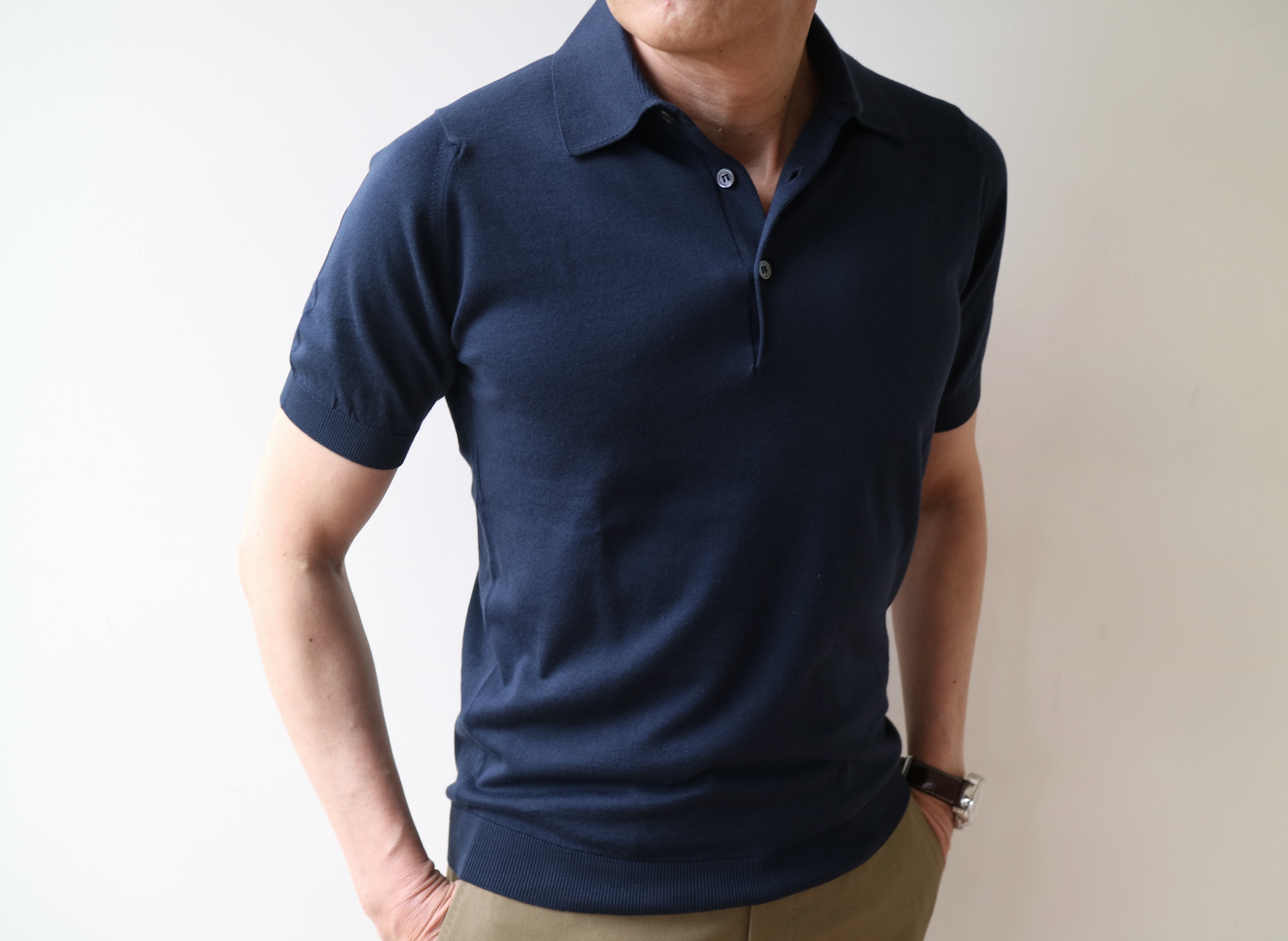 2月22日にご紹介の浅Vネックセーター「S3796」、23日の Vネックカーディガン「S3795」と ショートスリーブハイネックニット「S3813」。この数字4桁のモデルは、全てJapan Fit。日本からの別注モデルです。30ゲージのカシミアのような肌触りのコットン素材は変わらず、身頃を狭く、着丈を短くする事で、日本人の体型に、より合うモデルとして好評です。そして、今回ご案内する半袖のニットポロ「S3798」も、今までサイズで諦めていた方にも安心して着ていただける、ジャストフィツトのサイジングです。