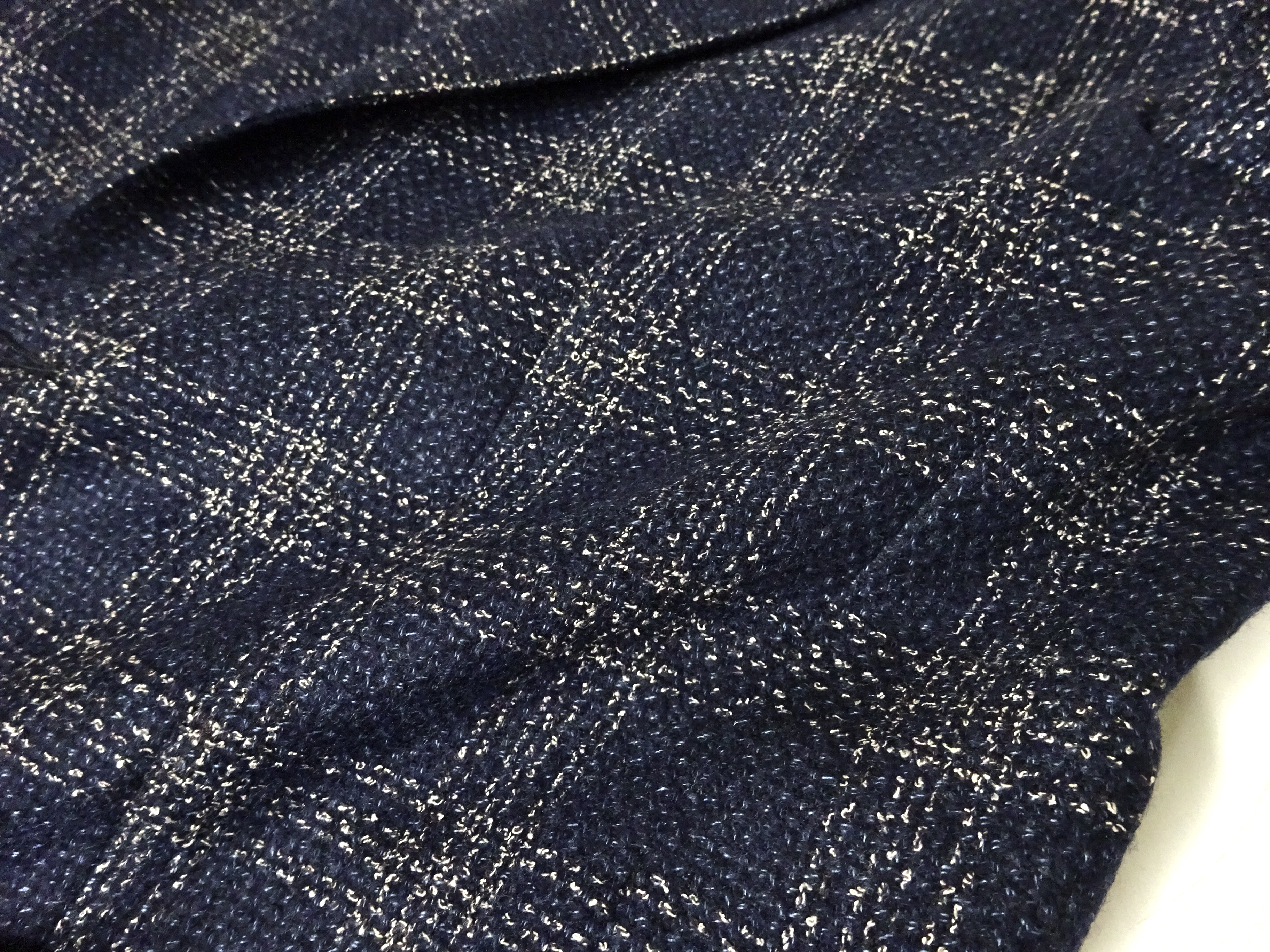 最後は、擦れたネイビーをベースにしたチェックジャケット。こちらもバスケット織りです。チェック柄にはオフホワイトとブラウンの糸が混ざっていて、落ち着きの中に渋みのある色使いです。